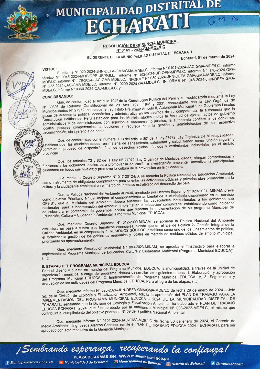 La presente Resolución de Gerencia Municipal aprueba el Plan de Trabajo 2024 del Programa Municipal de Educación, Cultura y Ciudadanía Ambiental de la Municipalidad Distrital de Echarati (Cusco), con la finalidad de definir las actividades de educación, cultura y ciudadanía ambiental que se desarrollaran en la localidad durante el presente año.