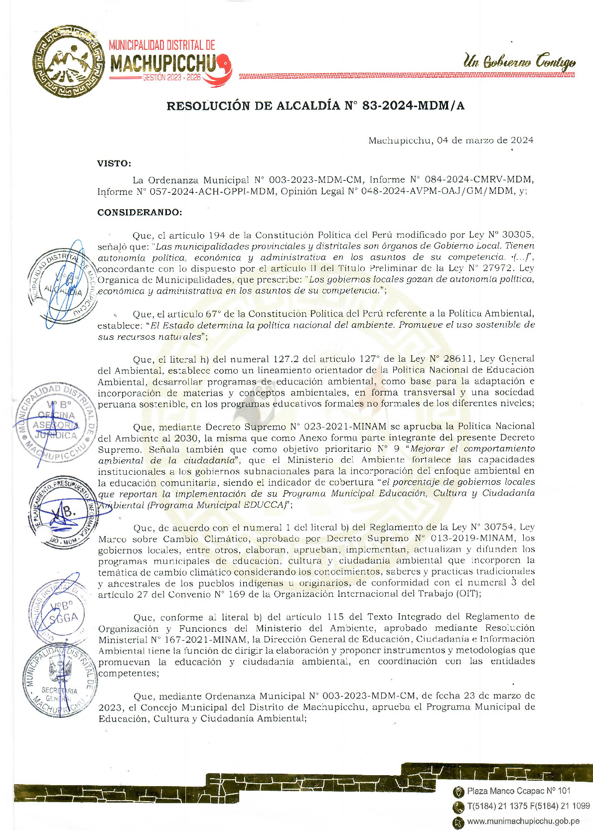 La presente Resolución de Alcaldía aprueba el Plan de Trabajo 2024 del Programa Municipal de Educación, Cultura y Ciudadanía Ambiental de la Municipalidad Distrital de Machupicchu (Cusco), con la finalidad de definir las actividades de educación, cultura y ciudadanía ambiental que se desarrollaran en la localidad durante el presente año.