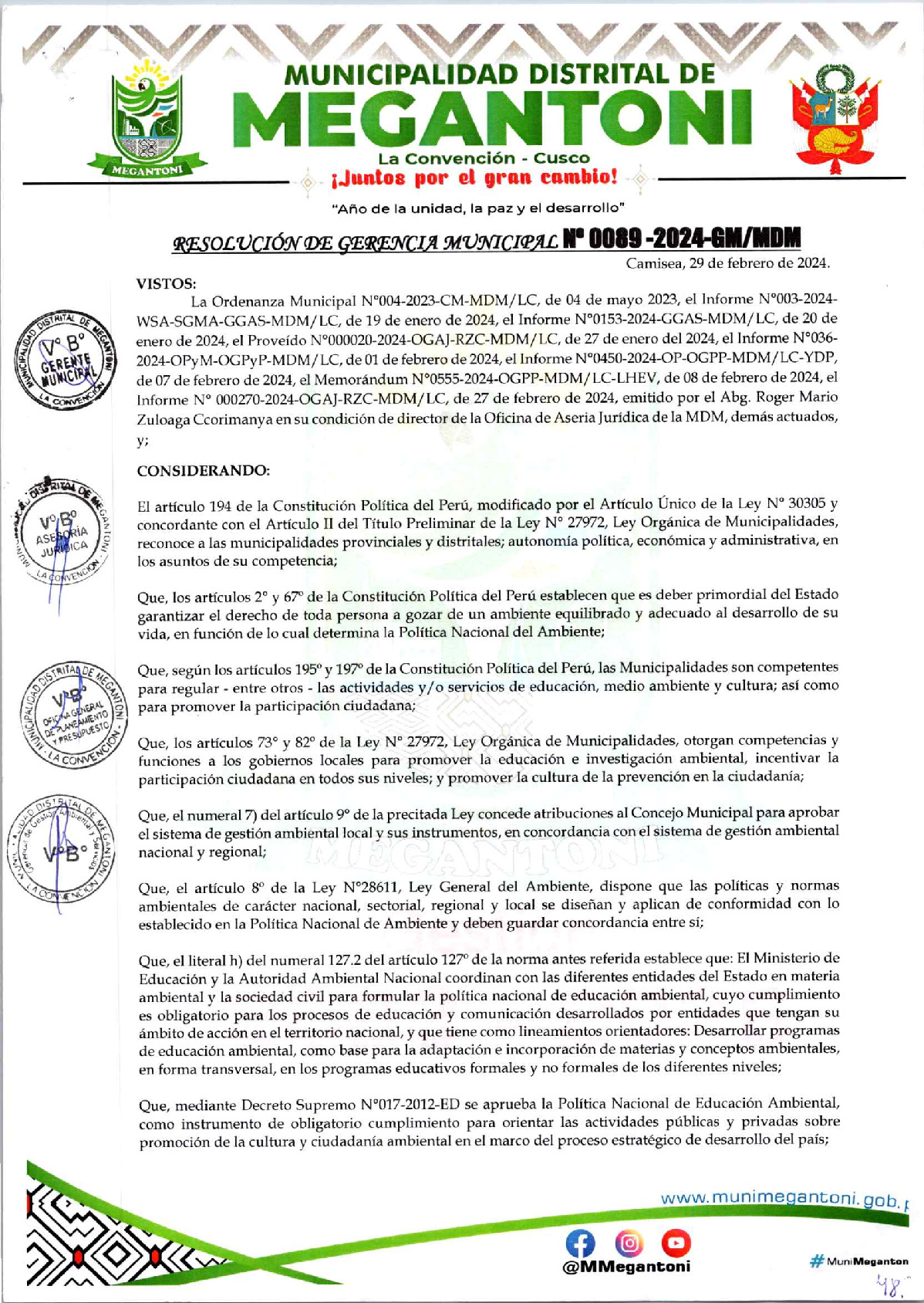 La presente Resolución de Gerencia Municipal aprueba el Plan de Trabajo 2024 del Programa Municipal de Educación, Cultura y Ciudadanía Ambiental de la Municipalidad Distrital de Megantoni (Cusco), con la finalidad de definir las actividades de educación, cultura y ciudadanía ambiental que se desarrollaran en la localidad durante el presente año.