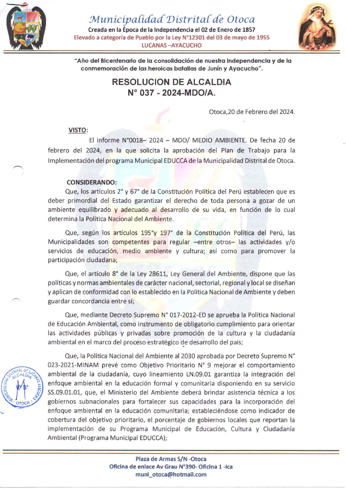 La presente Resolución de Alcaldía aprueba el Plan de Trabajo 2024 del Programa Municipal de Educación, Cultura y Ciudadanía Ambiental de la Municipalidad Distrital de Otoca - (Ayacucho), con la finalidad de definir las actividades de educación, cultura y ciudadanía ambiental que se desarrollaran en la localidad durante el presente año.