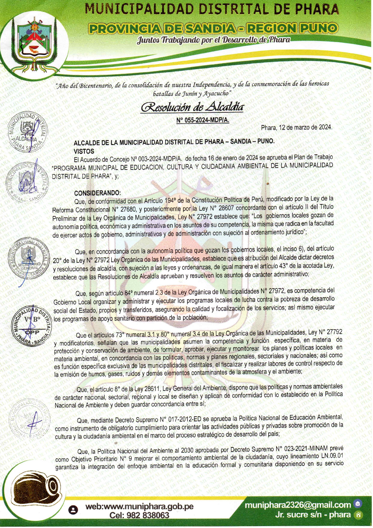 La presente Resolución de Alcaldía aprueba el Plan de Trabajo 2024 del Programa Municipal de Educación, Cultura y Ciudadanía Ambiental de la Municipalidad Distrital de Phara - (Puno), con la finalidad de definir las actividades de educación, cultura y ciudadanía ambiental que se desarrollaran en la localidad durante el presente año.