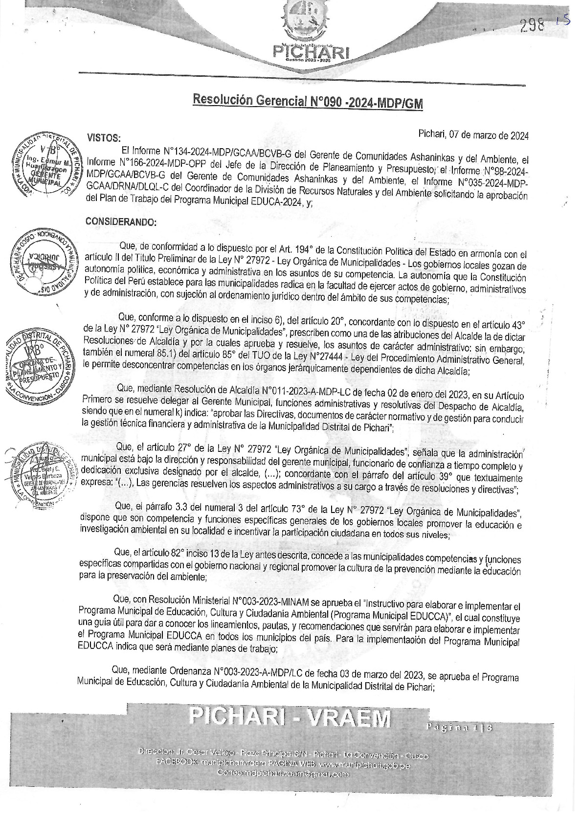 La presente Resolución de Gerencia Municipal aprueba el Plan de Trabajo 2024 del Programa Municipal de Educación, Cultura y Ciudadanía Ambiental de la Municipalidad Distrital de Pichari (Cusco), con la finalidad de definir las actividades de educación, cultura y ciudadanía ambiental que se desarrollaran en la localidad durante el presente año.