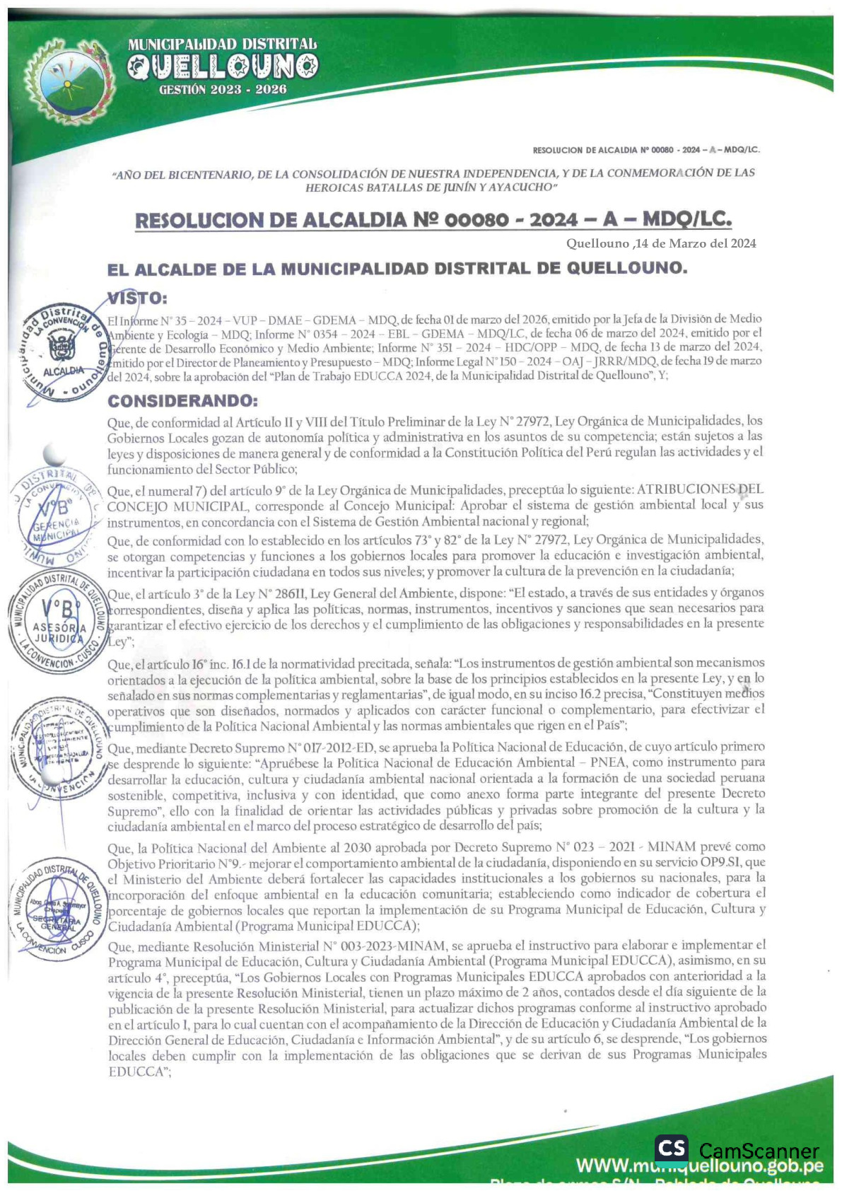 La presente Resolución de Alcaldía aprueba el Plan de Trabajo 2024 del Programa Municipal de Educación, Cultura y Ciudadanía Ambiental de la Municipalidad Distrital de Quellouno - (Cusco), con la finalidad de definir las actividades de educación, cultura y ciudadanía ambiental que se desarrollaran en la localidad durante el presente año.