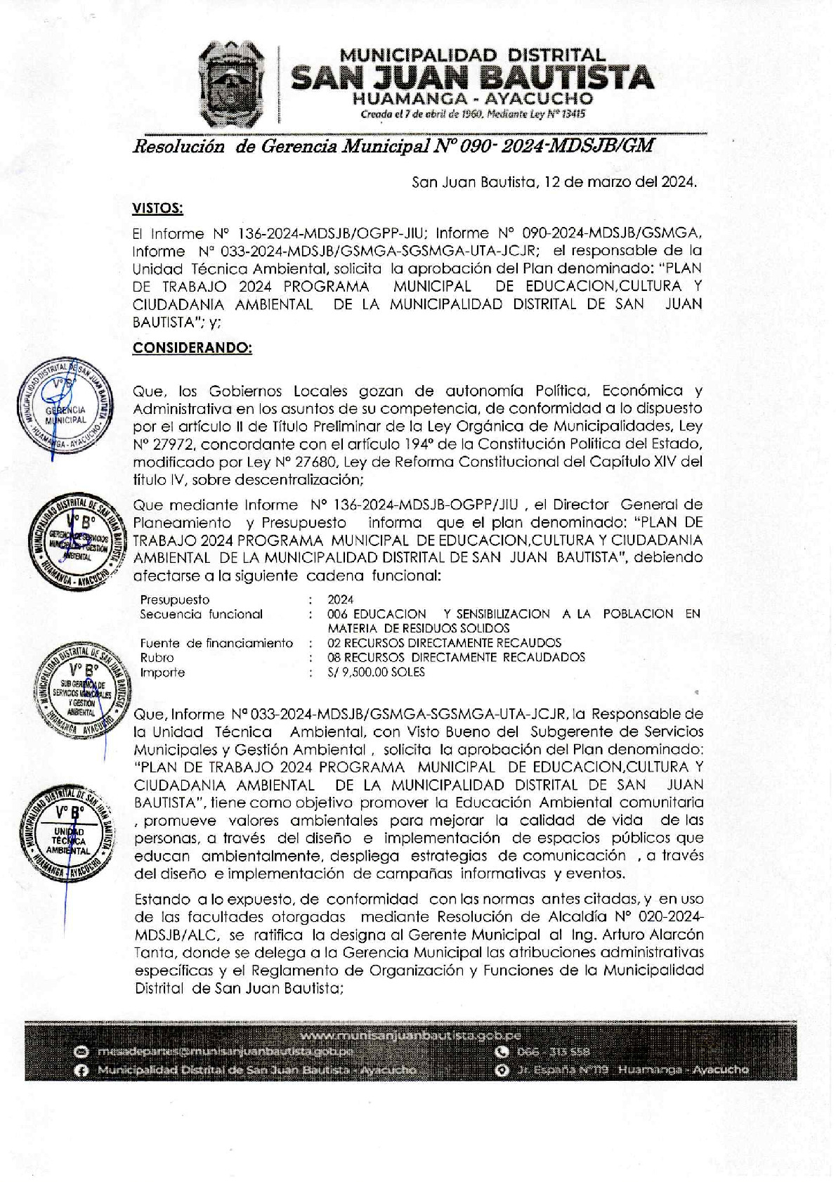 La presente Resolución de Gerencia Municipal aprueba el Plan de Trabajo 2024 del Programa Municipal de Educación, Cultura y Ciudadanía Ambiental de la Municipalidad Distrital de San Juan Bautista (Ayacucho), con la finalidad de definir las actividades de educación, cultura y ciudadanía ambiental que se desarrollaran en la localidad durante el presente año.