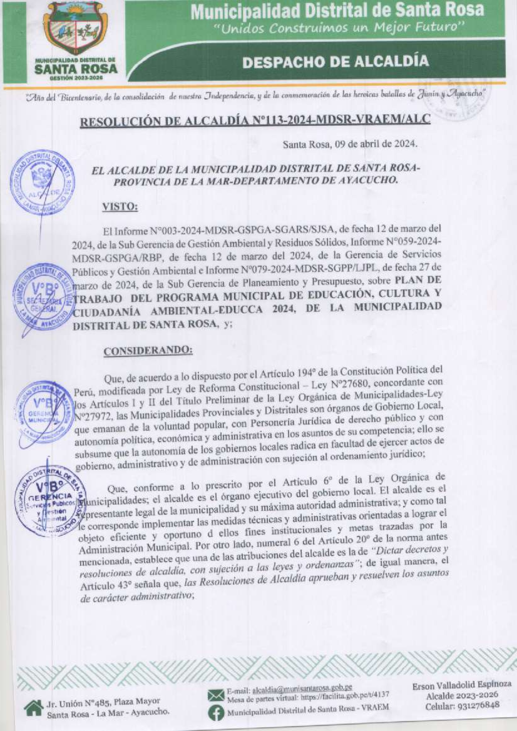 La presente Resolución de Alcaldía aprueba el Plan de Trabajo 2024 del Programa Municipal de Educación, Cultura y Ciudadanía Ambiental de la Municipalidad Distrital de Santa Rosa - (Ayacucho), con la finalidad de definir las actividades de educación, cultura y ciudadanía ambiental que se desarrollaran en la localidad durante el presente año.