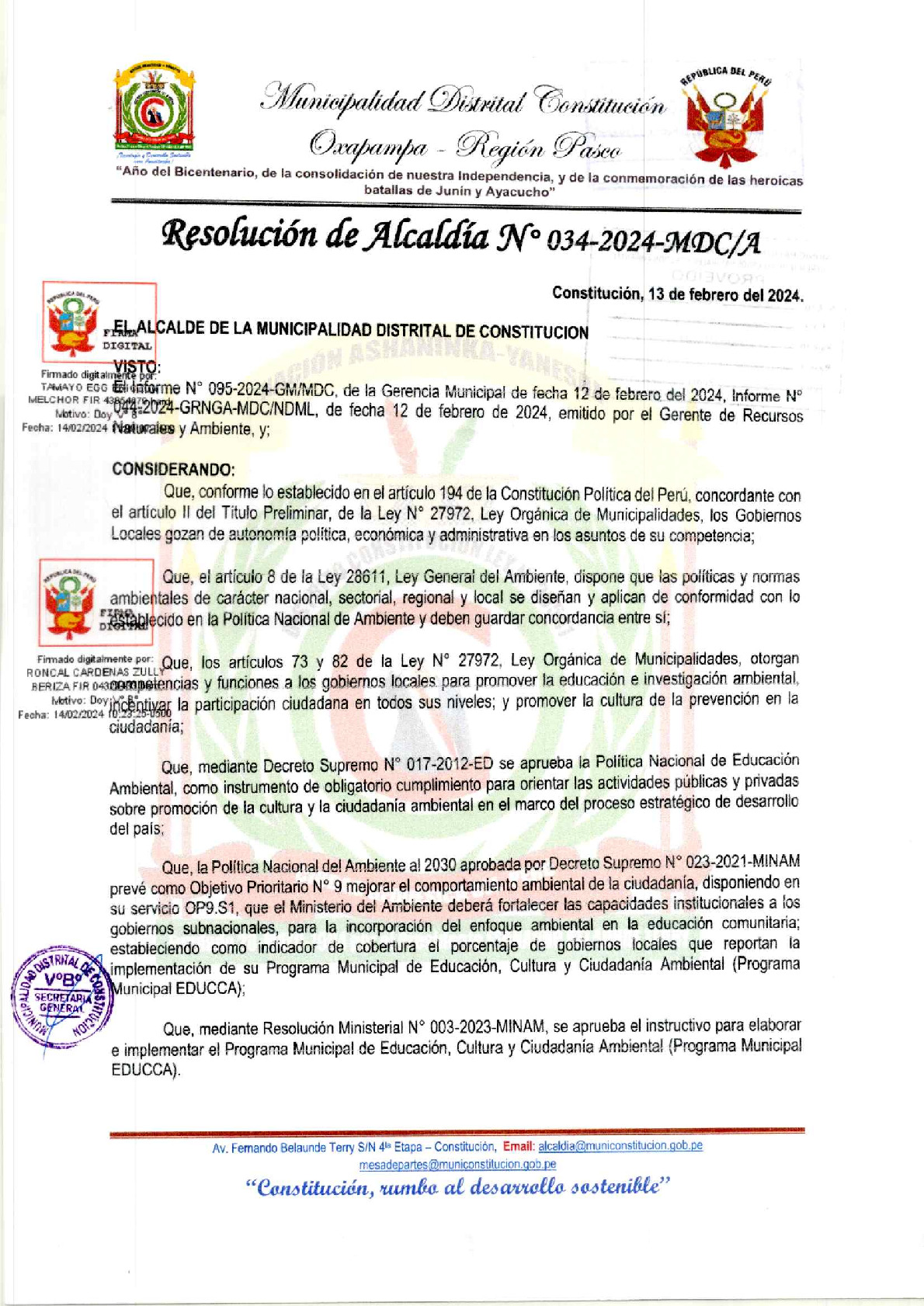 La presente Resolución de Alcaldía aprueba el Plan de Trabajo 2024 del Programa Municipal de Educación, Cultura y Ciudadanía Ambiental de la Municipalidad Distrital de Constitución - Oxapampa (Pasco), con la finalidad de definir las actividades de educación, cultura y ciudadanía ambiental que se desarrollaran en la localidad durante el presente año.