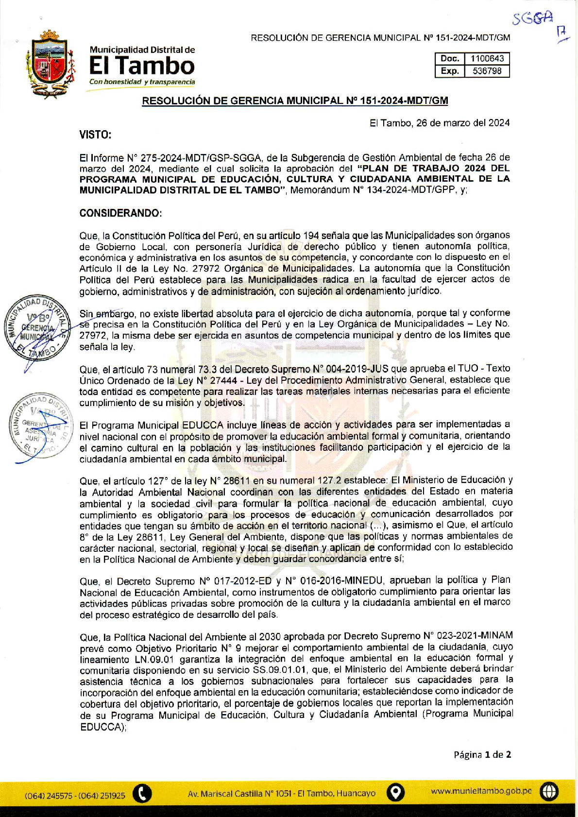 La presente Resolución de Gerencia Municipal aprueba el Plan de Trabajo 2024 del Programa Municipal de Educación, Cultura y Ciudadanía Ambiental de la Municipalidad Distrital de El Tambo (Junín), con la finalidad de definir las actividades de educación, cultura y ciudadanía ambiental que se desarrollaran en la localidad durante el presente año.