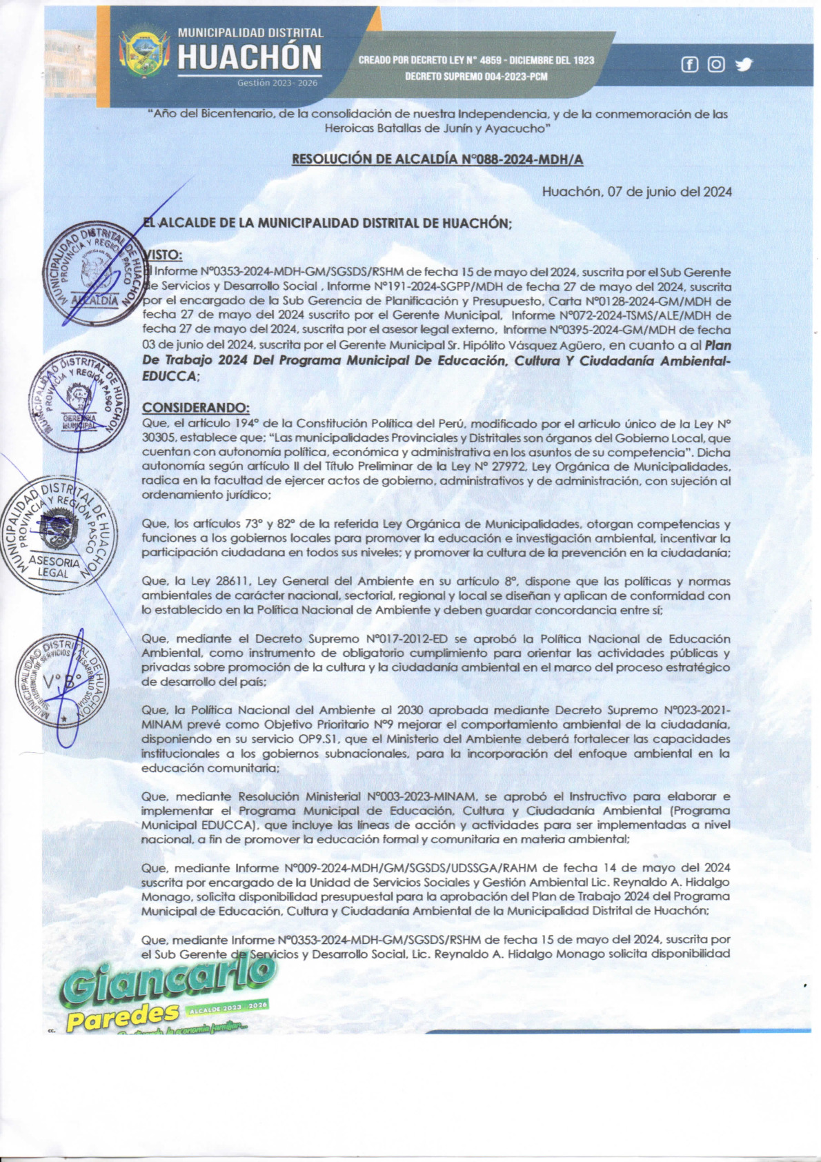 La presente Resolución de Alcaldía aprueba el Plan de Trabajo 2024 del Programa Municipal de Educación, Cultura y Ciudadanía Ambiental de la Municipalidad Distrital de Huachón - Pasco (Pasco), con la finalidad de definir las actividades de educación, cultura y ciudadanía ambiental que se desarrollaran en la localidad durante el presente año.