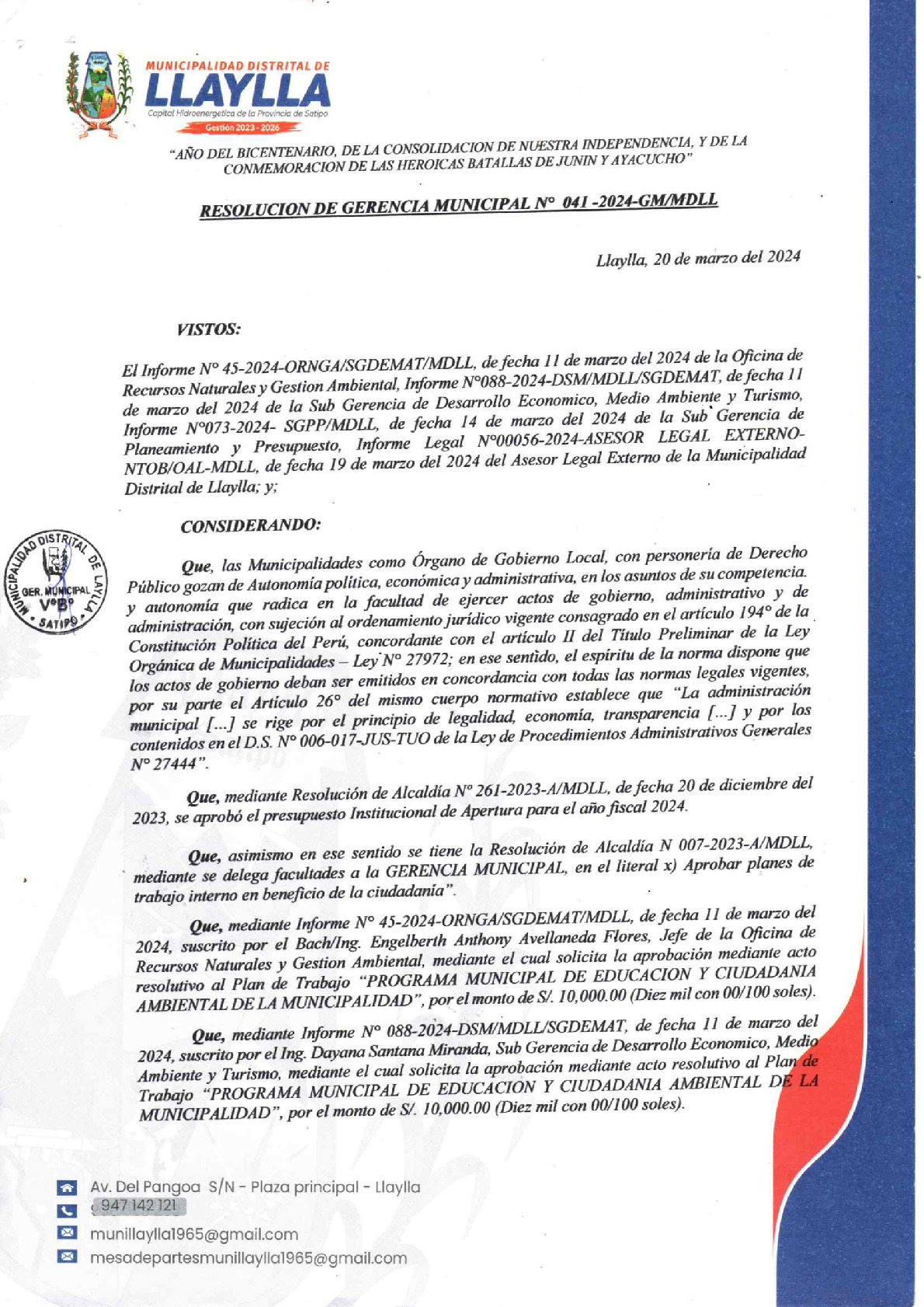 La presente Resolución de Gerencia Municipal aprueba el Plan de Trabajo 2024 del Programa Municipal de Educación, Cultura y Ciudadanía Ambiental de la Municipalidad Distrital de Llaylla (Junín), con la finalidad de definir las actividades de educación, cultura y ciudadanía ambiental que se desarrollaran en la localidad durante el presente año.