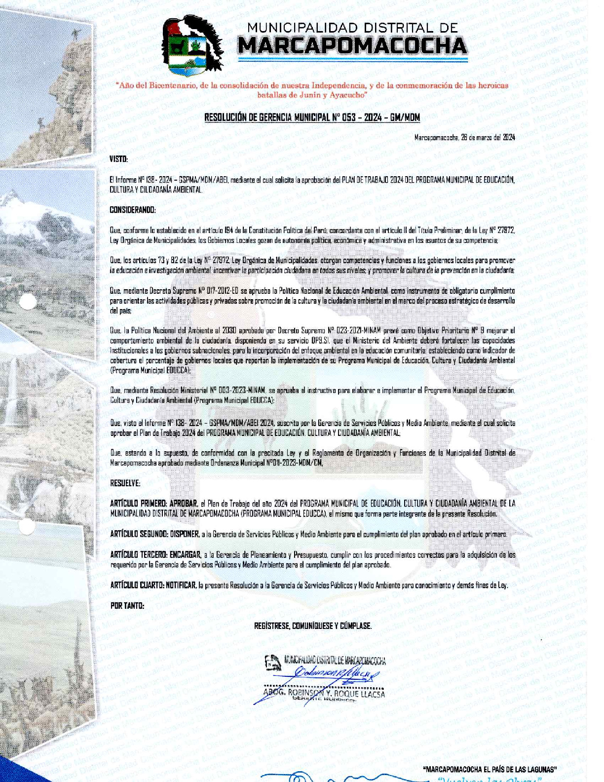 La presente Resolución de Gerencia Municipal aprueba el Plan de Trabajo 2024 del Programa Municipal de Educación, Cultura y Ciudadanía Ambiental de la Municipalidad Distrital de Marcapomacocha (Junín), con la finalidad de definir las actividades de educación, cultura y ciudadanía ambiental que se desarrollaran en la localidad durante el presente año.