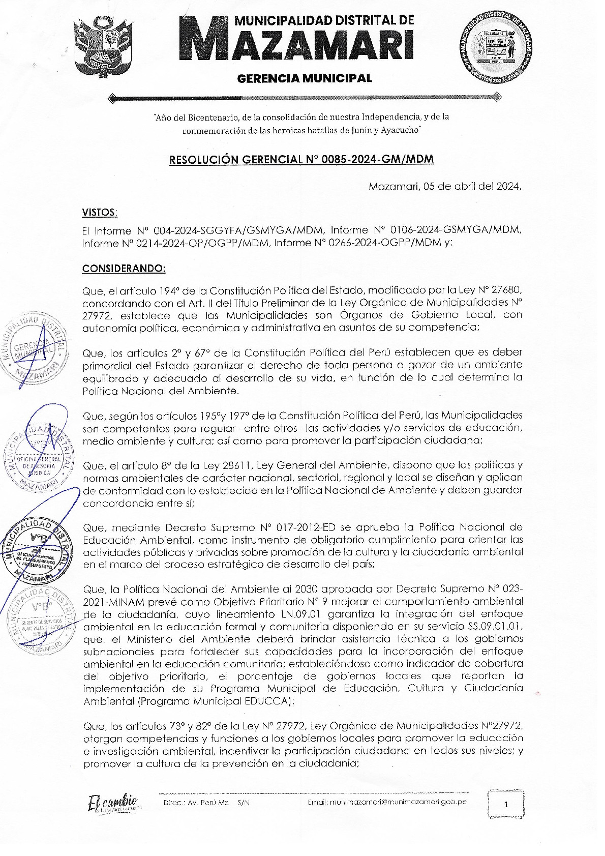 La presente Resolución de Gerencia Municipal aprueba el Plan de Trabajo 2024 del Programa Municipal de Educación, Cultura y Ciudadanía Ambiental de la Municipalidad Distrital de Mazamari (Junín), con la finalidad de definir las actividades de educación, cultura y ciudadanía ambiental que se desarrollaran en la localidad durante el presente año.