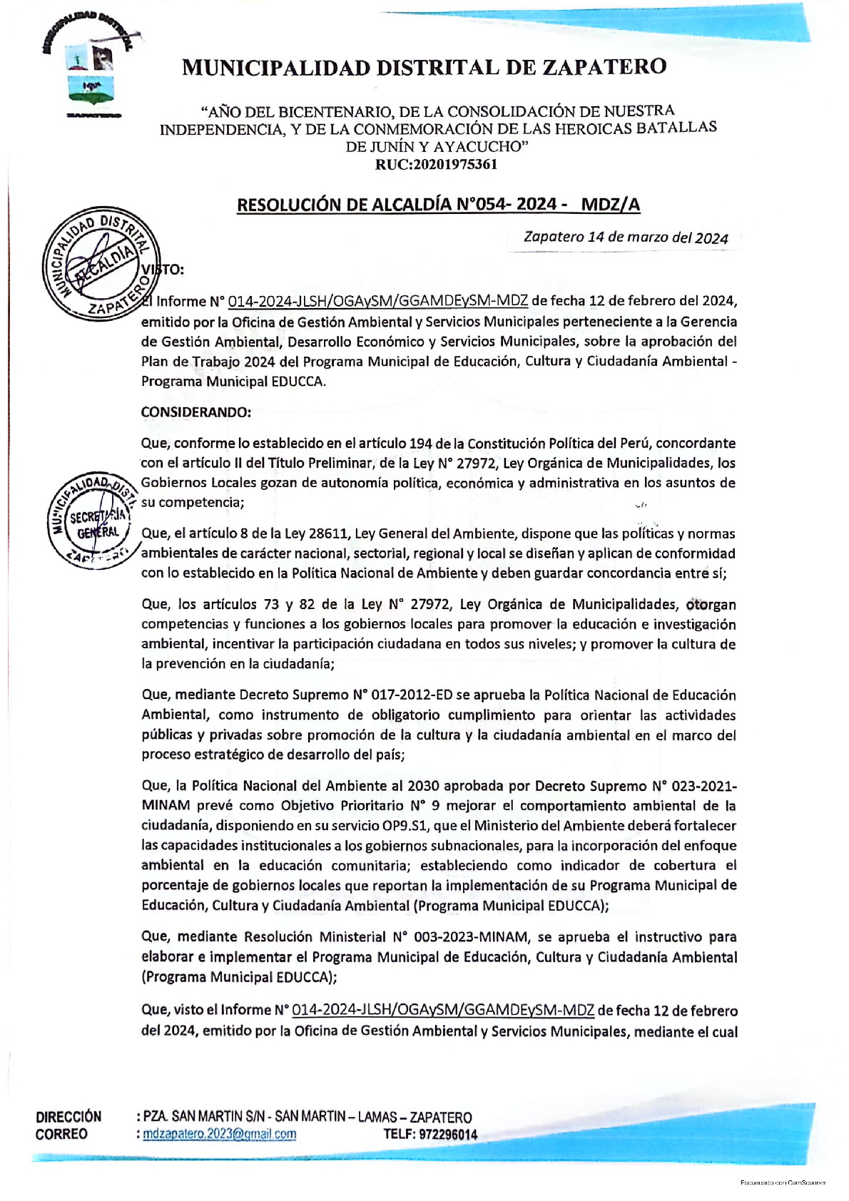 La presente Resolución de Alcaldía aprueba el Plan de Trabajo 2024 del Programa Municipal de Educación, Cultura y Ciudadanía Ambiental de la Municipalidad Distrital de Zapatero - Lamas (San Martín), con la finalidad de definir las actividades de educación, cultura y ciudadanía ambiental que se desarrollaran en la localidad durante el presente año.