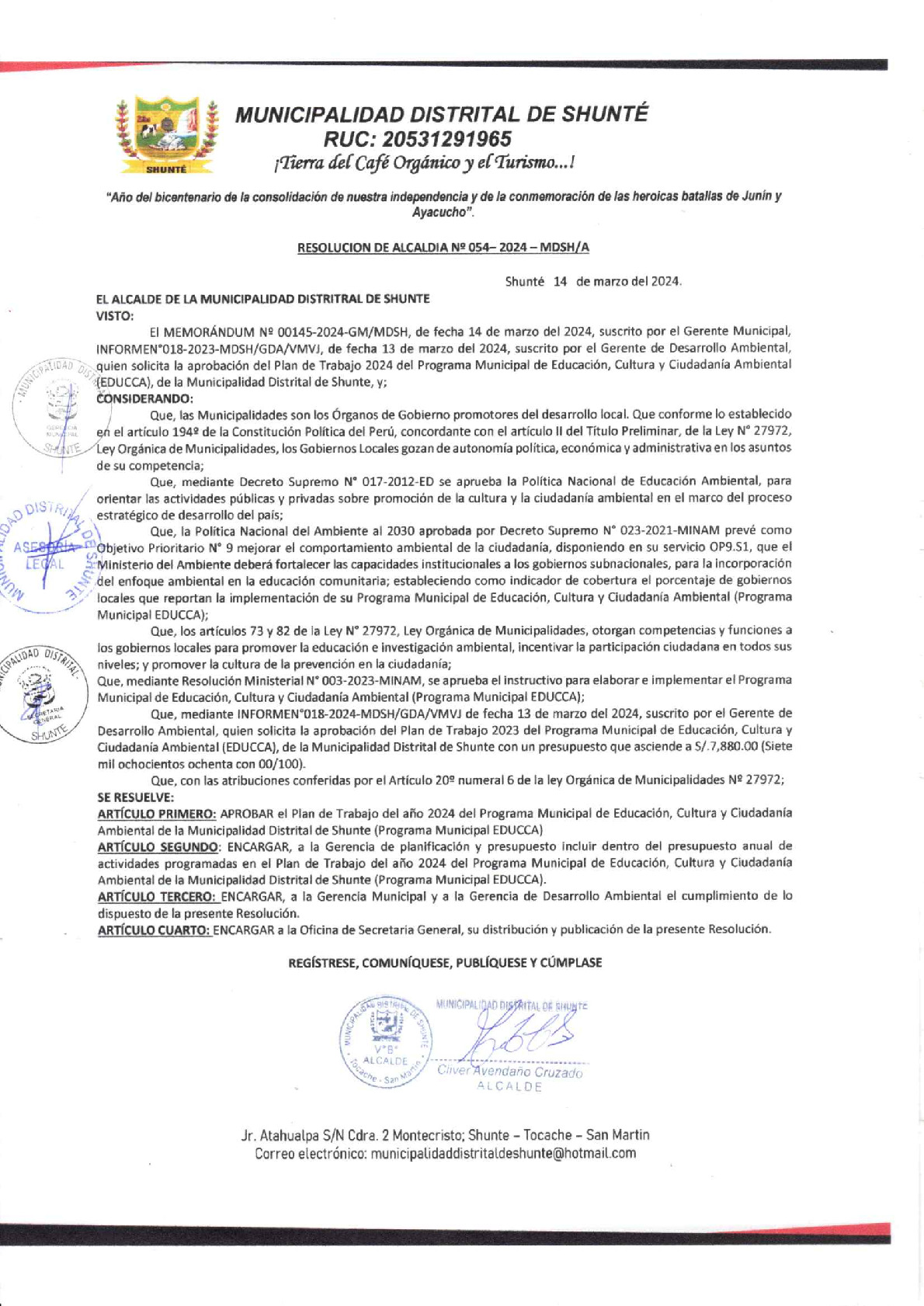 La presente Resolución de Alcaldía aprueba el Plan de Trabajo 2024 del Programa Municipal de Educación, Cultura y Ciudadanía Ambiental de la Municipalidad Distrital de Shunté - Tocache (San Martín), con la finalidad de definir las actividades de educación, cultura y ciudadanía ambiental que se desarrollaran en la localidad durante el presente año.