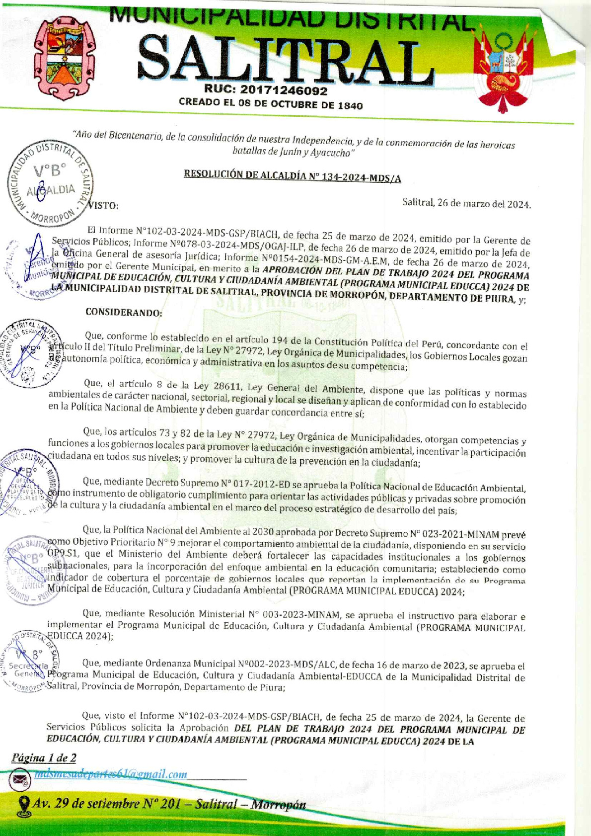 La presente Resolución de Alcaldía aprueba el Plan de Trabajo 2024 del Programa Municipal de Educación, Cultura y Ciudadanía Ambiental de la Municipalidad Distrital de Salitral - Morropón (Piura), con la finalidad de definir las actividades de educación, cultura y ciudadanía ambiental que se desarrollaran en la localidad durante el presente año.