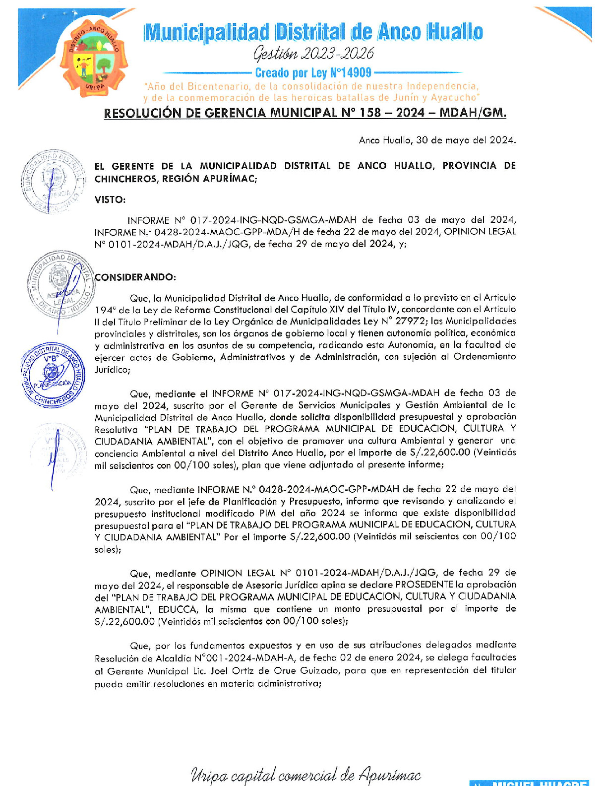 La presente Resolución de Gerencia Municipal aprueba el Plan de Trabajo 2024 del Programa Municipal de Educación, Cultura y Ciudadanía Ambiental de la Municipalidad Distrital de Anco Huallo - Chincheros (Apurímac), con la finalidad de definir las actividades de educación, cultura y ciudadanía ambiental que se desarrollaran en la localidad durante el presente año.