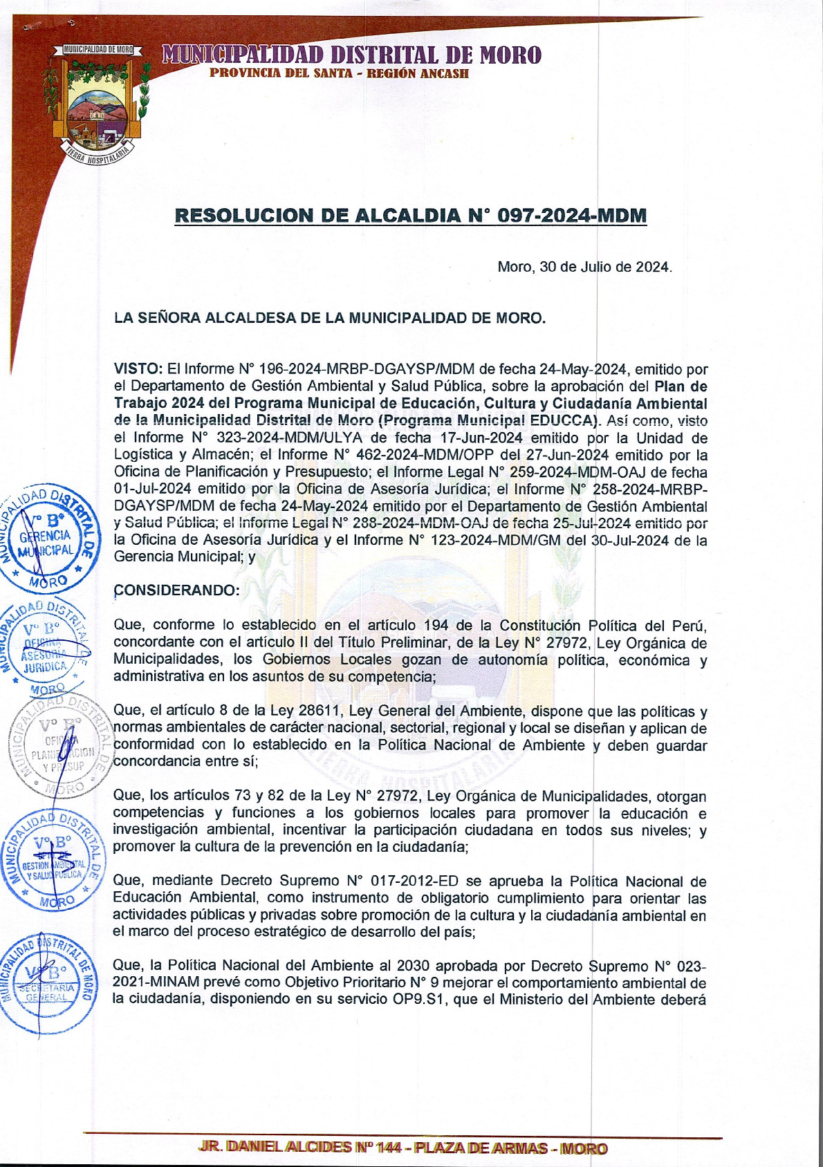 La presente Resolución de Alcaldía aprueba el Plan de Trabajo 2024 del Programa Municipal de Educación, Cultura y Ciudadanía Ambiental de la Municipalidad Distrital de Moro - Santa (Áncash), con la finalidad de definir las actividades de educación, cultura y ciudadanía ambiental que se desarrollaran en la localidad durante el presente año.