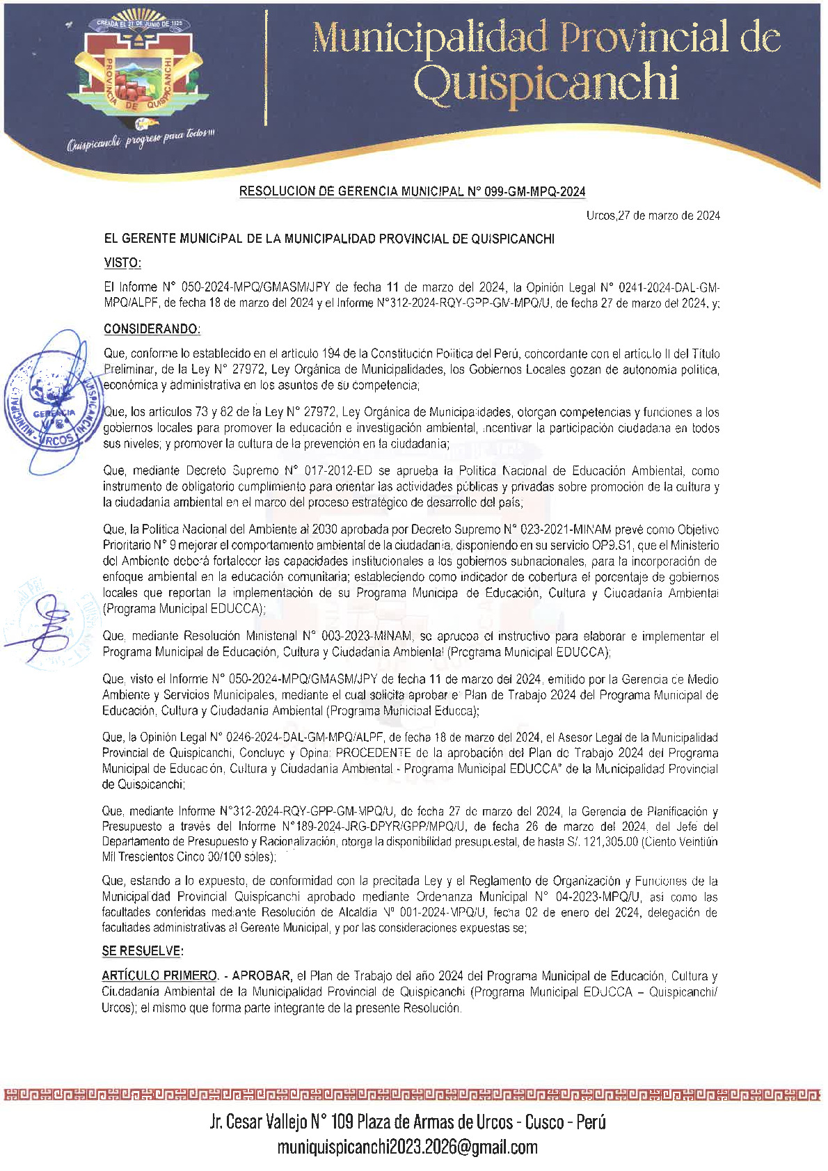 La presente Resolución de Gerencia Municipal aprueba el Plan de Trabajo 2024 del Programa Municipal de Educación, Cultura y Ciudadanía Ambiental de la Municipalidad Provincial de Quispicanchi (Cusco), con la finalidad de definir las actividades de educación, cultura y ciudadanía ambiental que se desarrollaran en la localidad durante el presente año.