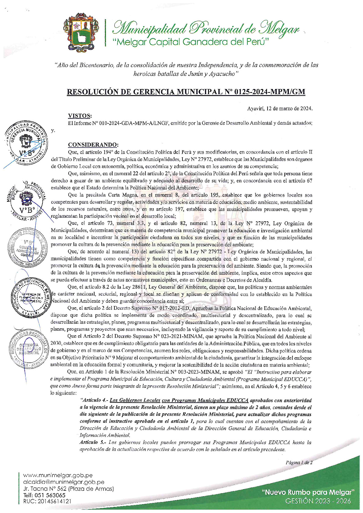 La presente Resolución de Gerencia Municipal aprueba el Plan de Trabajo 2024 del Programa Municipal de Educación, Cultura y Ciudadanía Ambiental de la Municipalidad Provincial de Melgar (Puno), con la finalidad de definir las actividades de educación, cultura y ciudadanía ambiental que se desarrollaran en la localidad durante el presente año.