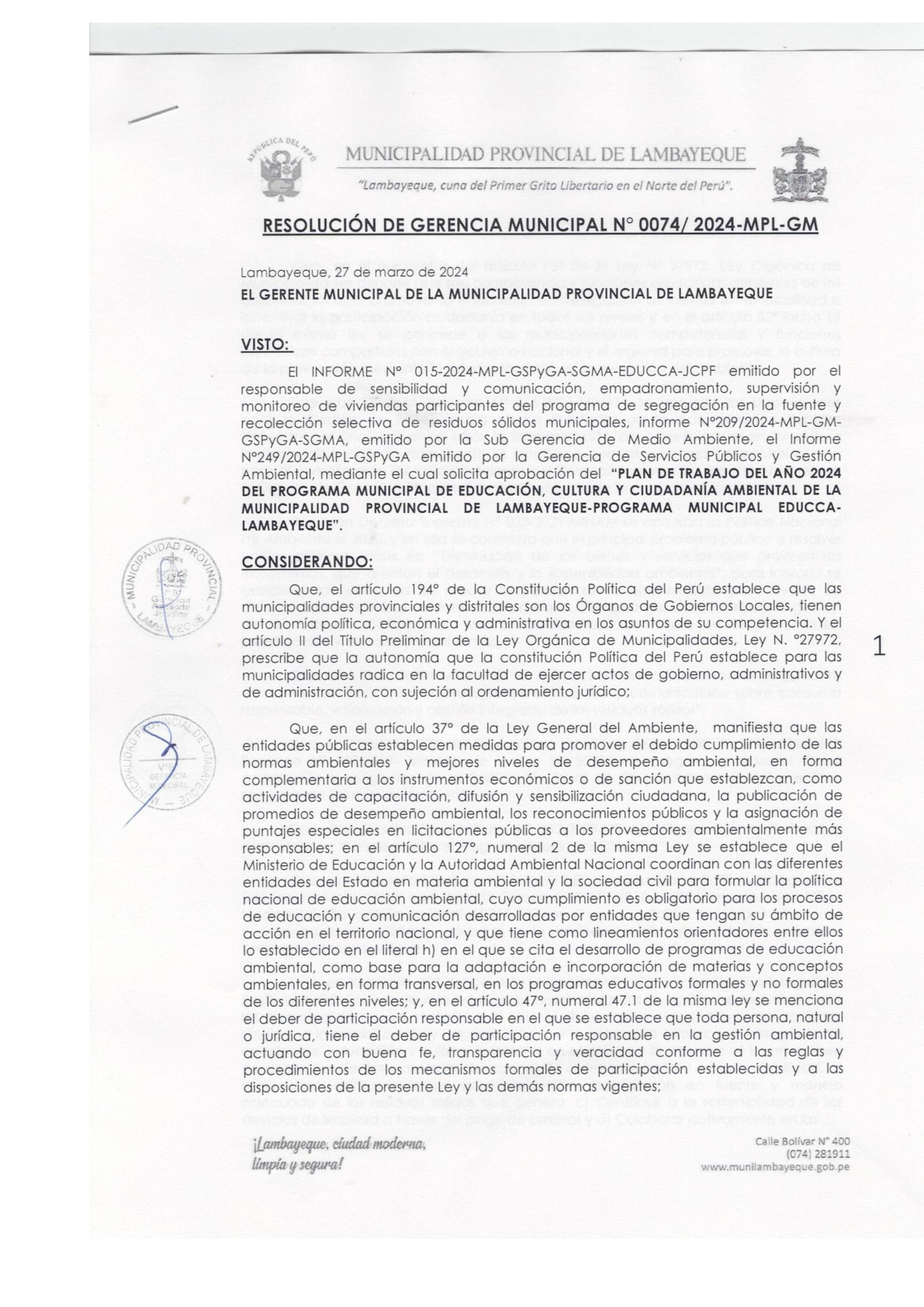 La presente Resolución de Gerencia Municipal aprueba el Plan de Trabajo 2024 del Programa Municipal de Educación, Cultura y Ciudadanía Ambiental de la Municipalidad Provincial de Lambayeque - Lambayeque (Lambayeque), con la finalidad de definir las actividades de educación, cultura y ciudadanía ambiental que se desarrollaran en la localidad durante el presente año.