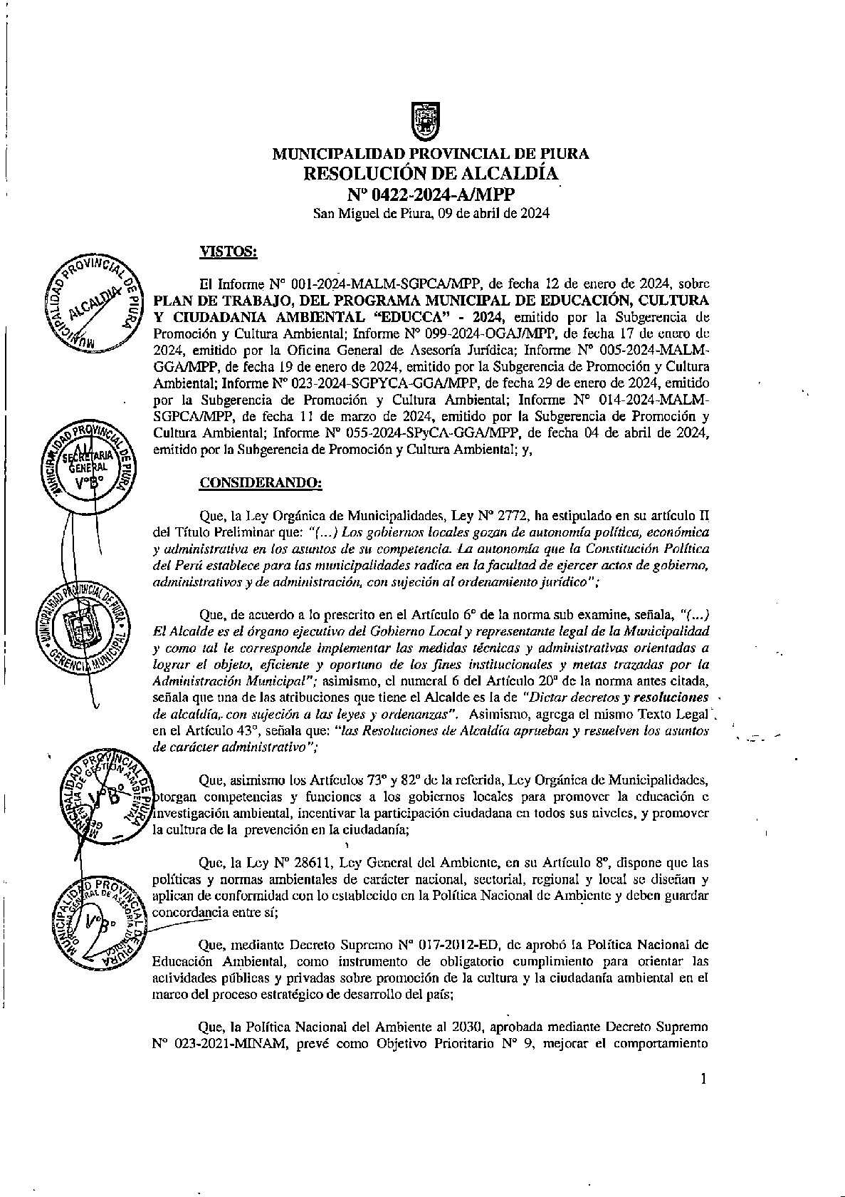 La presente Resolución de Alcaldía aprueba el Plan de Trabajo 2024 del Programa de Educación, Cultura y Ciudadanía Ambiental de la Municipalidad Provincial de Piura - Piura (Piura), con la finalidad de definir las actividades de educación, cultura y ciudadanía ambiental que se desarrollaran en la localidad durante el presente año.