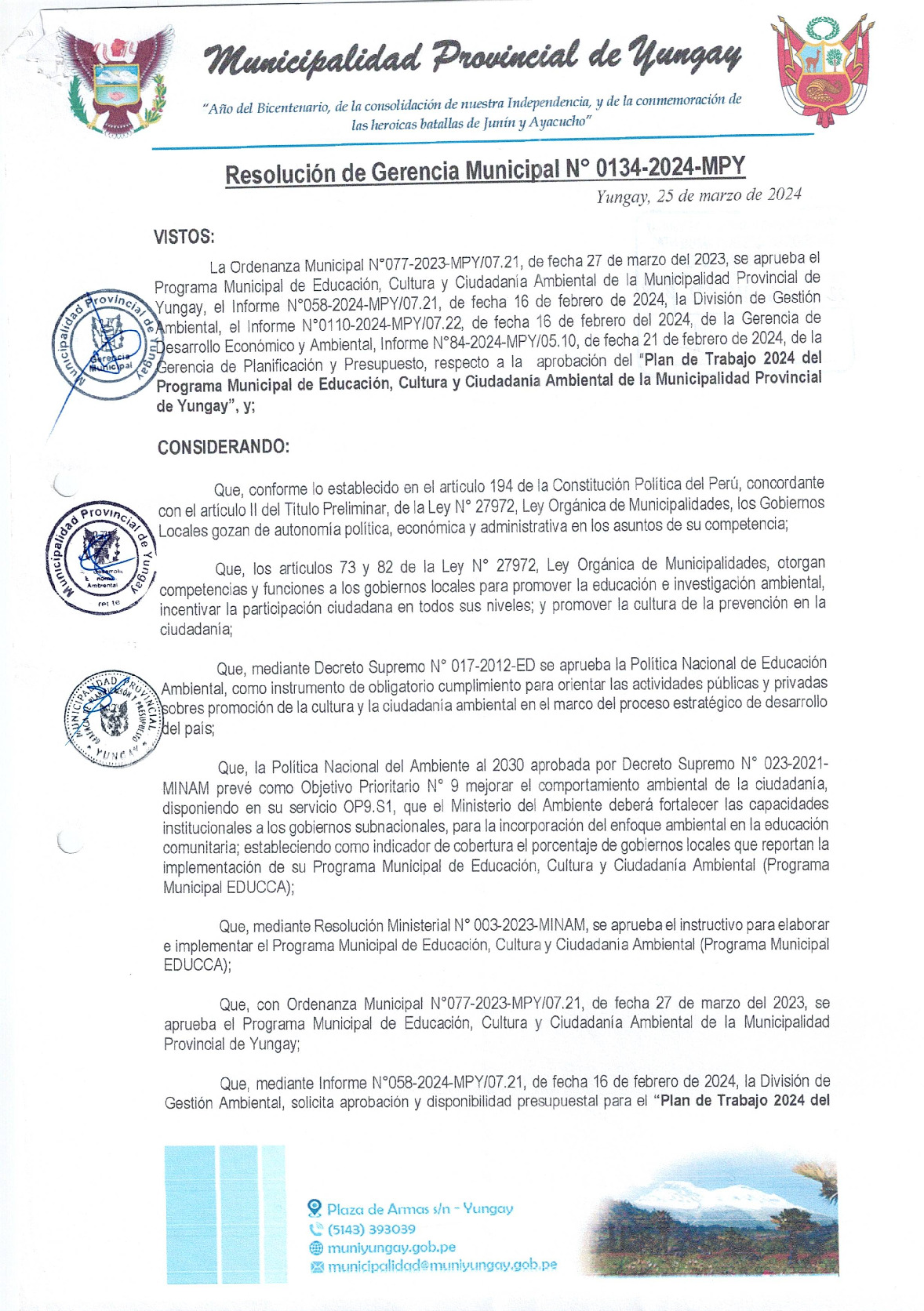 La presente Resolución de Gerencia Municipal aprueba el Plan de Trabajo 2024 del Programa de Educación, Cultura y Ciudadanía Ambiental de la Municipalidad Provincial de Yungay - Áncash, con la finalidad de definir las actividades de educación, cultura y ciudadanía ambiental que se desarrollaran en la localidad durante el presente año.