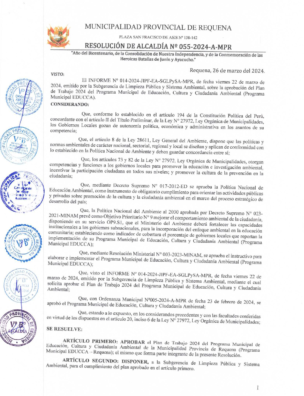 La presente Resolución de Alcaldía aprueba el Plan de Trabajo 2024 del Programa Municipal de Educación, Cultura y Ciudadanía Ambiental de la Municipalidad Provincial de Requena - Loreto, con la finalidad de definir las actividades de educación, cultura y ciudadanía ambiental que se desarrollaran en la localidad durante el presente año.