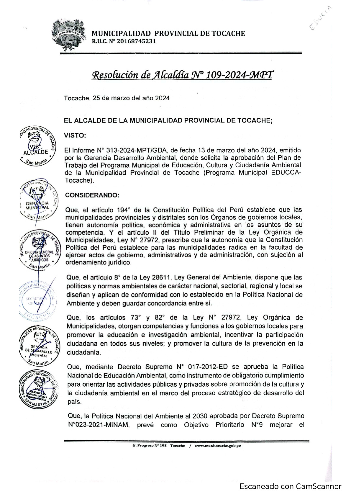 La presente Resolución de Alcaldía aprueba el Plan de Trabajo 2024 del Programa Municipal de Educación, Cultura y Ciudadanía Ambiental de la Municipalidad Provincial de Tocache - (San Martín), con la finalidad de definir las actividades de educación, cultura y ciudadanía ambiental que se desarrollaran en la localidad durante el presente año.