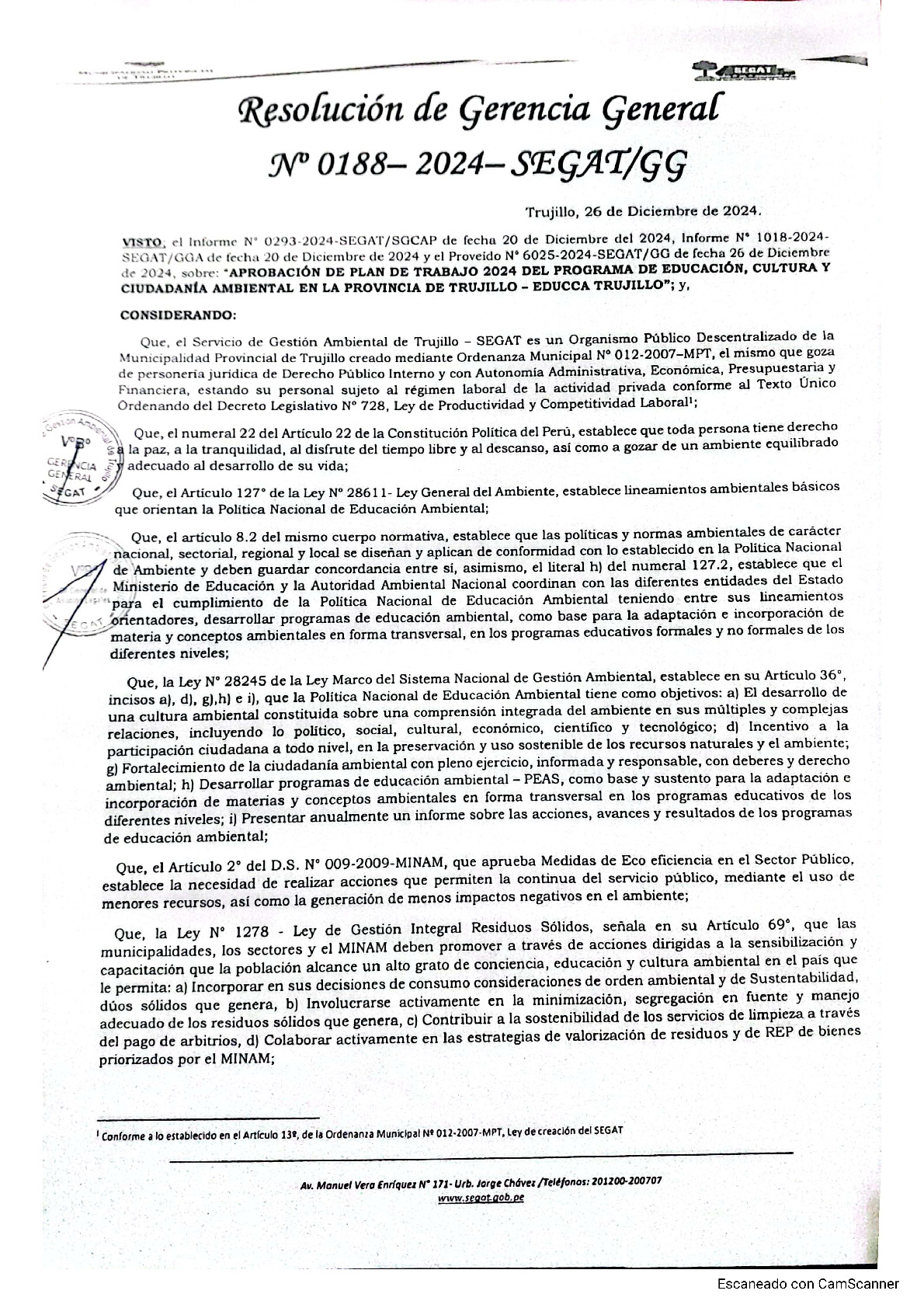 La presente Resolución de Gerencia Municipal aprueba el Plan de Trabajo 2024 del Programa Municipal de Educación, Cultura y Ciudadanía Ambiental de la Municipalidad Provincial de Trujillo - (La Libertad), con la finalidad de definir las actividades de educación, cultura y ciudadanía ambiental que se desarrollaran en la localidad durante el presente año.