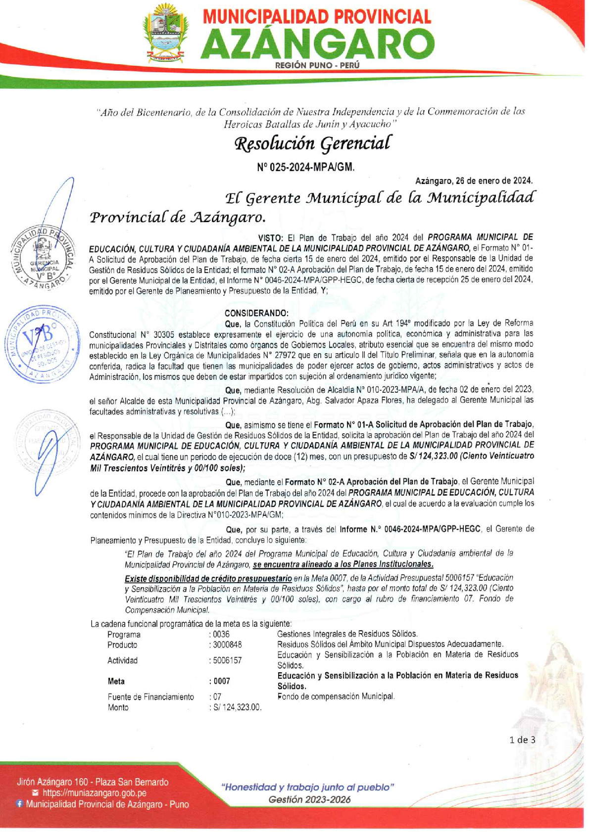 La presente Resolución de Gerencia Municipal aprueba el Plan de Trabajo 2024 del Programa Municipal de Educación, Cultura y Ciudadanía Ambiental de la Municipalidad Provincial de Azángaro (Puno), con la finalidad de definir las actividades de educación, cultura y ciudadanía ambiental que se desarrollaran en la localidad durante el presente año.