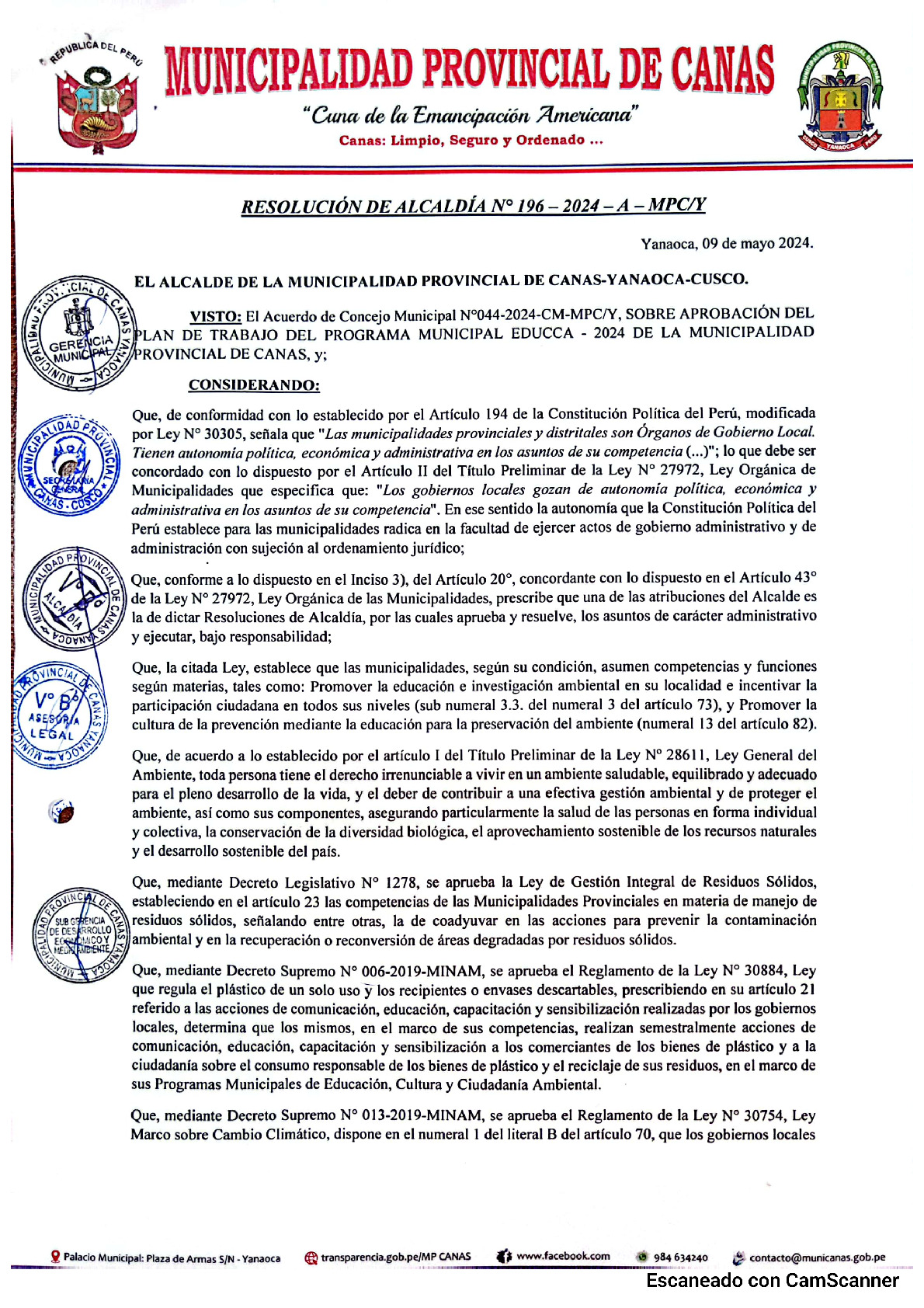 La presente Resolución de Alcaldía aprueba el Plan de Trabajo 2024 del Programa Municipal de Educación, Cultura y Ciudadanía Ambiental de la Municipalidad Provincial de Canas - (Cusco), con la finalidad de definir las actividades de educación, cultura y ciudadanía ambiental que se desarrollaran en la localidad durante el presente año.