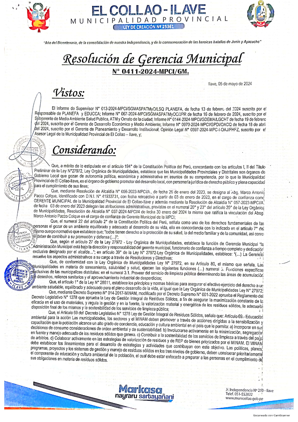 La presente Resolución de Gerencia Municipal aprueba el Plan de Trabajo 2024 del Programa Municipal de Educación, Cultura y Ciudadanía Ambiental de la Municipalidad Provincial de El Collao (Puno), con la finalidad de definir las actividades de educación, cultura y ciudadanía ambiental que se desarrollaran en la localidad durante el presente año.