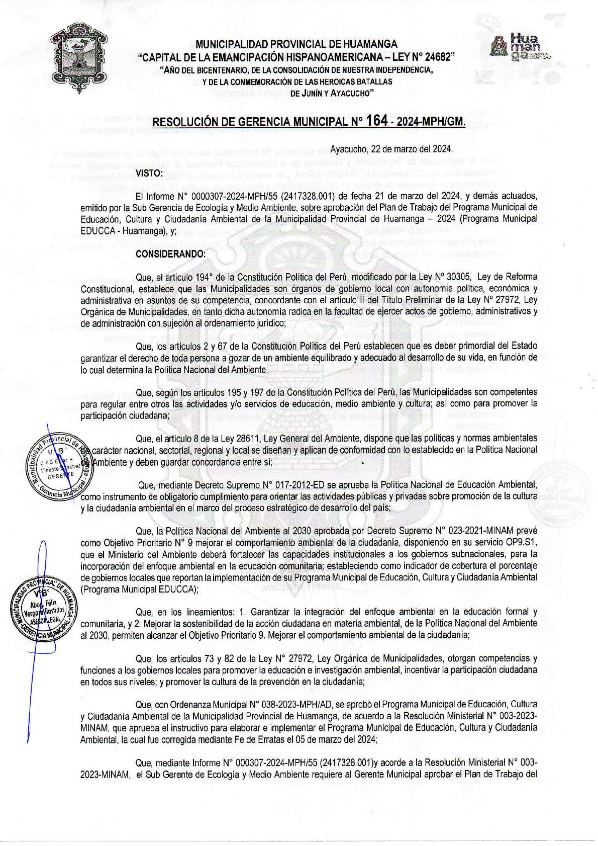 La presente Resolución de Gerencia Municipal aprueba el Plan de Trabajo 2024 del Programa Municipal de Educación, Cultura y Ciudadanía Ambiental de la Municipalidad Provincial de Huamanga (Ayacucho), con la finalidad de definir las actividades de educación, cultura y ciudadanía ambiental que se desarrollaran en la localidad durante el presente año.