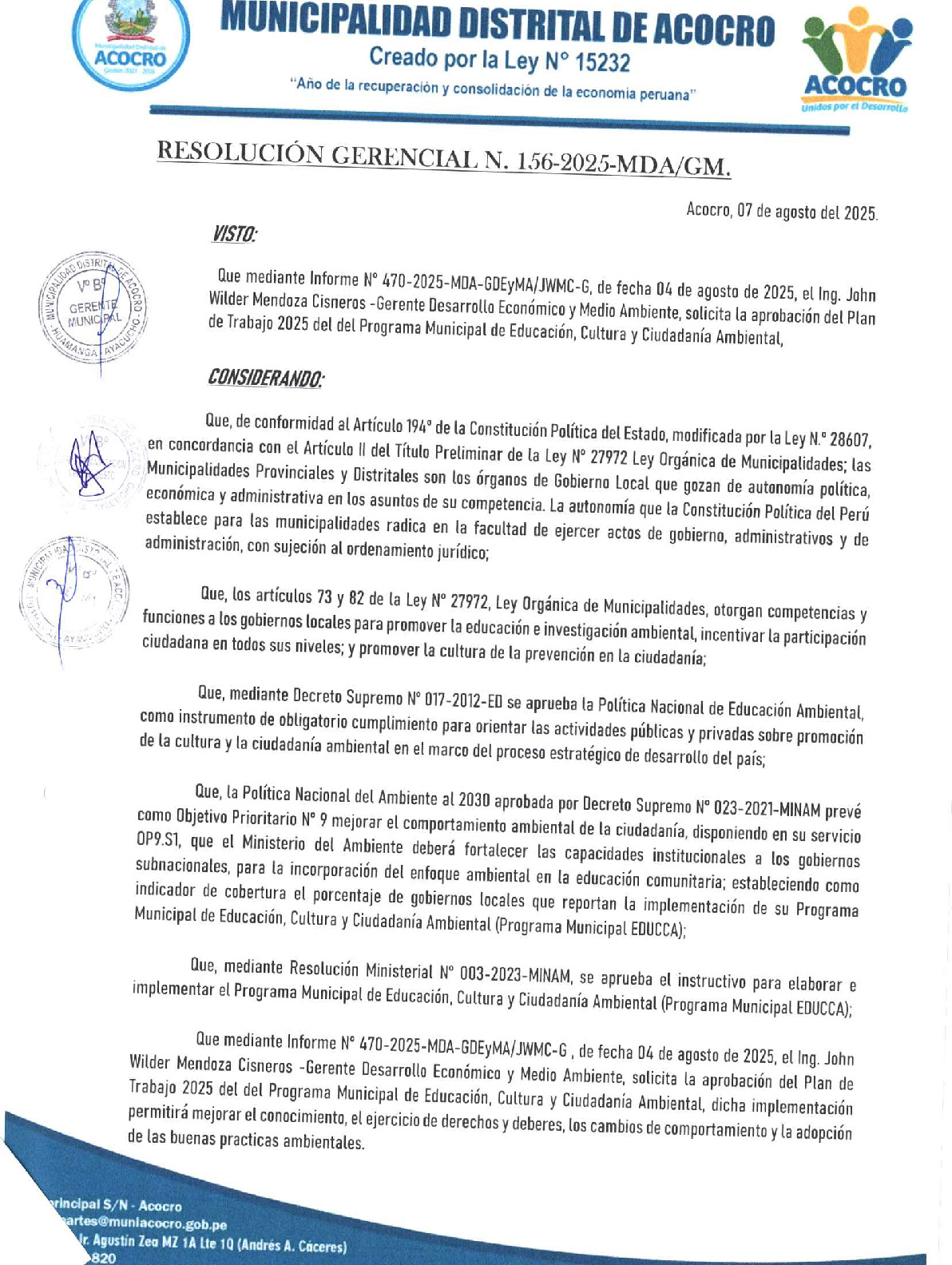 La presente Resolución de Gerencia Municipal aprueba el Plan de Trabajo 2025 del Programa Municipal de Educación, Cultura y Ciudadanía Ambiental de la Municipalidad Distrital de Acocro - Huamanga (Ayacucho), con la finalidad de definir las actividades de educación, cultura y ciudadanía ambiental que se desarrollarán en la localidad durante el presente año.