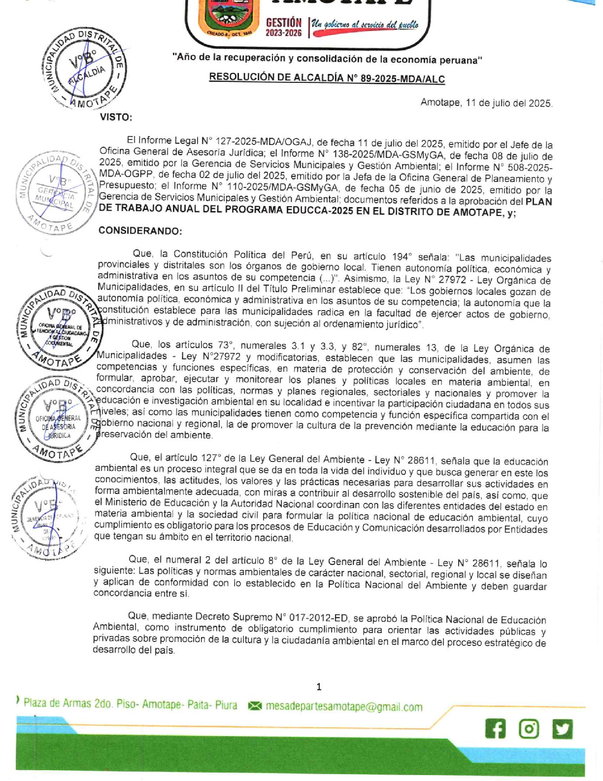 La presente Resolución de Alcaldía aprueba el Plan de Trabajo 2025 del Programa Municipal de Educación, Cultura y Ciudadanía Ambiental de la Municipalidad Distrital de Amotape - Paita (Piura), con la finalidad de definir las actividades de educación, cultura y ciudadanía ambiental que se desarrollarán en la localidad durante el presente año.