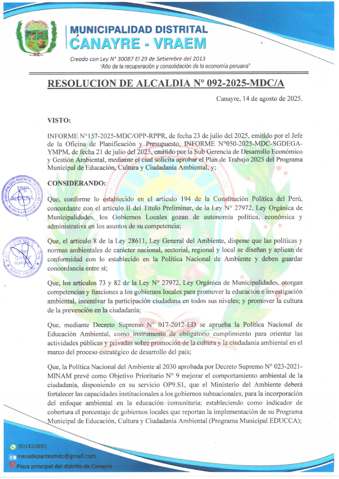 La presente Resolución de Alcaldía aprueba el Plan de Trabajo 2025 del Programa Municipal de Educación, Cultura y Ciudadanía Ambiental de la Municipalidad Distrital de Canayre - Huanta (Ayacucho), con la finalidad de definir las actividades de educación, cultura y ciudadanía ambiental que se desarrollarán en la localidad durante el presente año.
