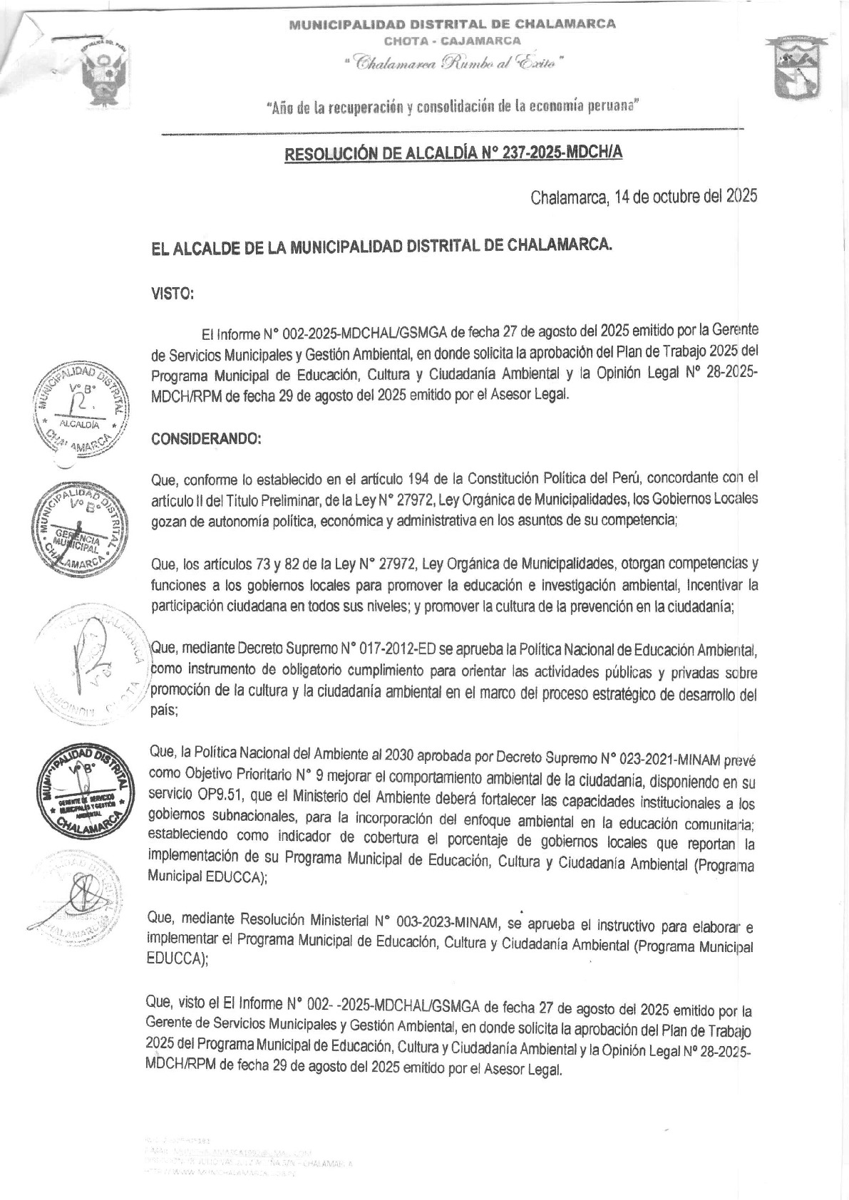 La presente Resolución de Alcaldía aprueba el Plan de Trabajo 2025 del Programa Municipal de Educación, Cultura y Ciudadanía Ambiental de la Municipalidad Distrital de Chalamarca - Chota (Cajamarca), con la finalidad de definir las actividades de educación, cultura y ciudadanía ambiental que se desarrollarán en la localidad durante el presente año.