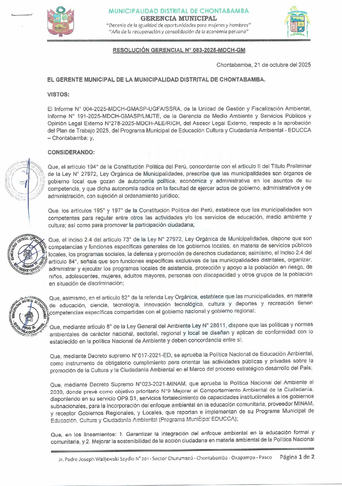 La presente Resolución de Gerencia Municipal aprueba el Plan de Trabajo 2025 del Programa Municipal de Educación, Cultura y Ciudadanía Ambiental de la Municipalidad Distrital de Chontabamba - Oxapampa (Pasco), con la finalidad de definir las actividades de educación, cultura y ciudadanía ambiental que se desarrollarán en la localidad durante el presente año.