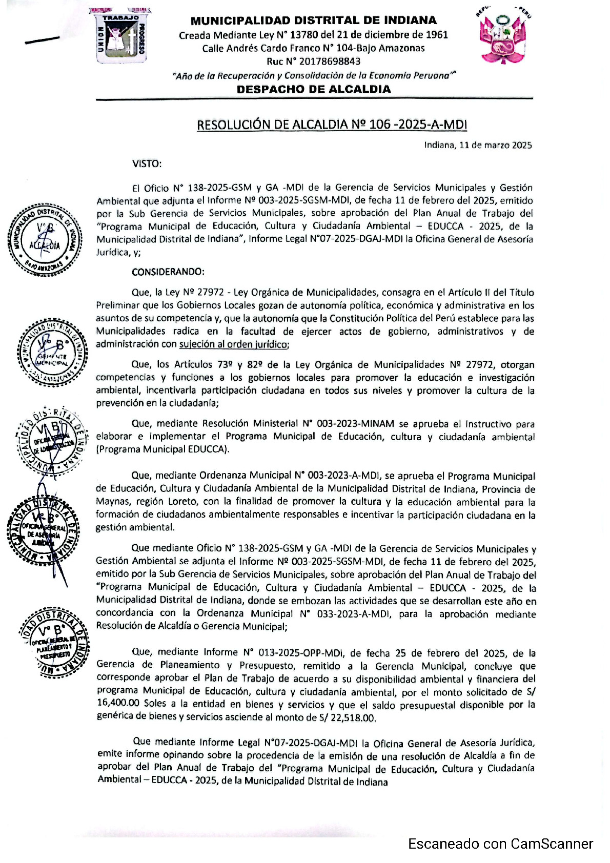 La presente Resolución de Alcaldía aprueba el Plan de Trabajo 2025 del Programa Municipal de Educación, Cultura y Ciudadanía Ambiental de la Municipalidad Distrital de Indiana -Maynas (Loreto), con la finalidad de definir las actividades de educación, cultura y ciudadanía ambiental que se desarrollaran en la localidad durante el presente año.