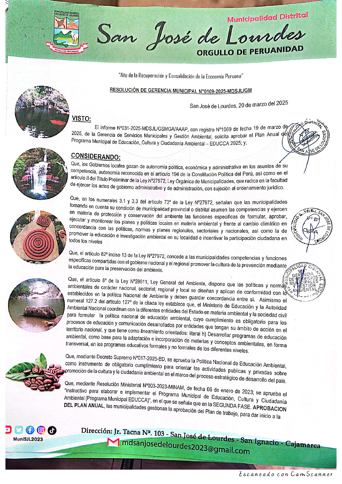 La presente Resolución de Gerencia Municipal aprueba el Plan de Trabajo 2025 del Programa Municipal de Educación, Cultura y Ciudadanía Ambiental de la Municipalidad Distrital de San José de Lourdes - San Ignacio (Cajamarca), con la finalidad de definir las actividades de educación, cultura y ciudadanía ambiental que se desarrollaran en la localidad durante el presente año.