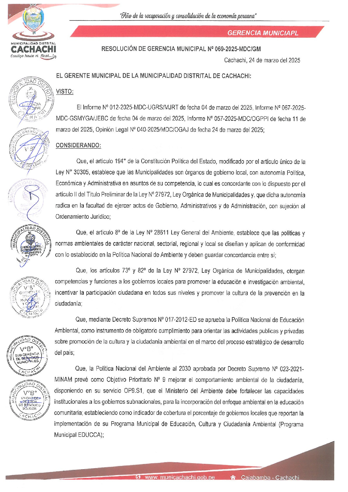 La presente Resolución de Gerencia Municipal aprueba el Plan de Trabajo 2025 del Programa Municipal de Educación, Cultura y Ciudadanía Ambiental de la Municipalidad Distrital de Cachachi - Cajabamba (Cajamarca), con la finalidad de definir las actividades de educación, cultura y ciudadanía ambiental que se desarrollaran en la localidad durante el presente año.