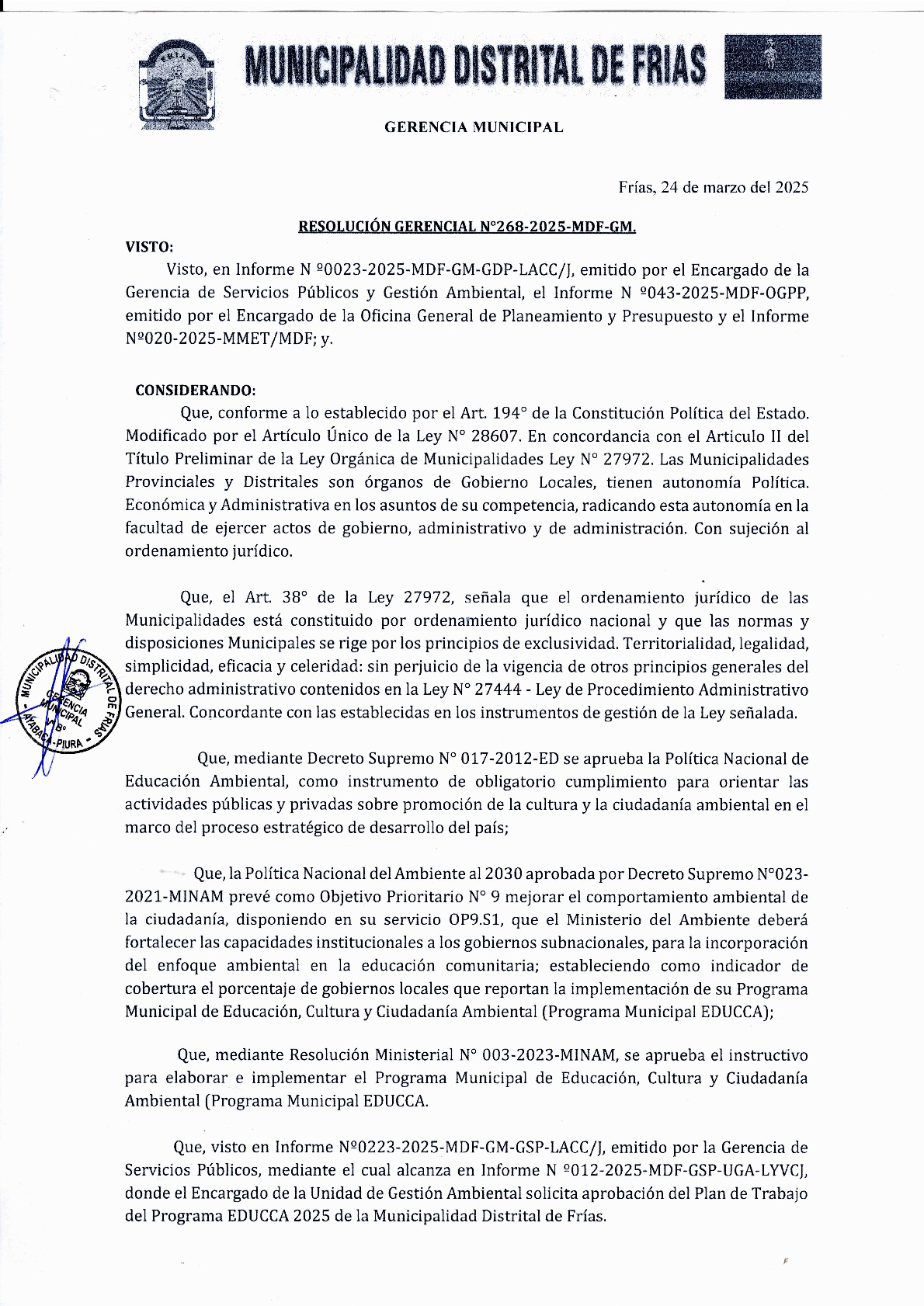 La presente Resolución de Gerencia Municipal aprueba el Plan de Trabajo 2025 del Programa Municipal de Educación, Cultura y Ciudadanía Ambiental de la Municipalidad Distrital de Frías - Ayabaca (Piura), con la finalidad de definir las actividades de educación, cultura y ciudadanía ambiental que se desarrollaran en la localidad durante el presente año.
