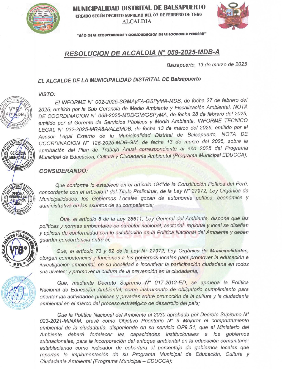 La presente Resolución de Alcaldía aprueba el Plan de Trabajo 2025 del Programa Municipal de Educación, Cultura y Ciudadanía Ambiental de la Municipalidad Distrital de Balsapuerto - Alto Amazonas (Loreto), con la finalidad de definir las actividades de educación, cultura y ciudadanía ambiental que se desarrollaran en la localidad durante el presente año.