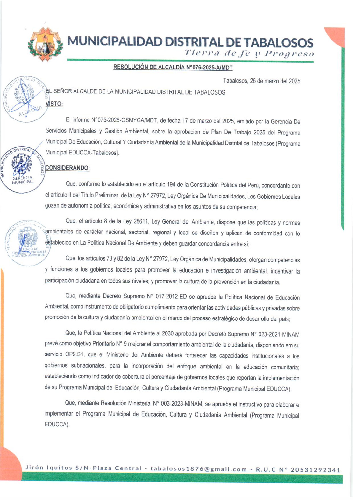 La presente Resolución de Alcaldía aprueba el Plan de Trabajo 2025 del Programa Municipal de Educación, Cultura y Ciudadanía Ambiental de la Municipalidad Distrital de Tabalosos -Lamas (San Martín), con la finalidad de definir las actividades de educación, cultura y ciudadanía ambiental que se desarrollaran en la localidad durante el presente año.