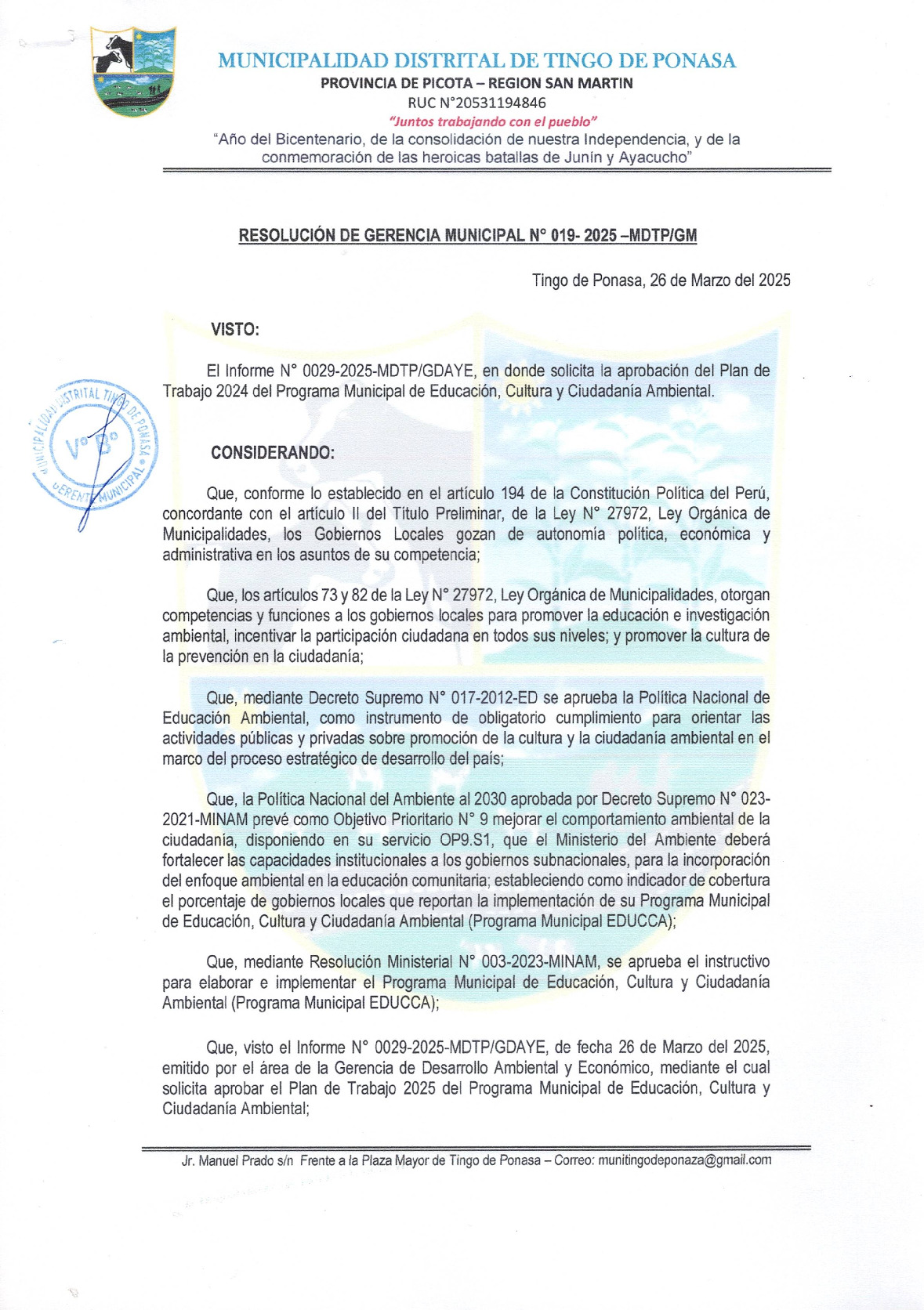La presente Resolución de Gerencia Municipal aprueba el Plan de Trabajo 2025 del Programa Municipal de Educación, Cultura y Ciudadanía Ambiental de la Municipalidad Distrital de Tingo de Ponasa - Picota (San Martín), con la finalidad de definir las actividades de educación, cultura y ciudadanía ambiental que se desarrollaran en la localidad durante el presente año.
