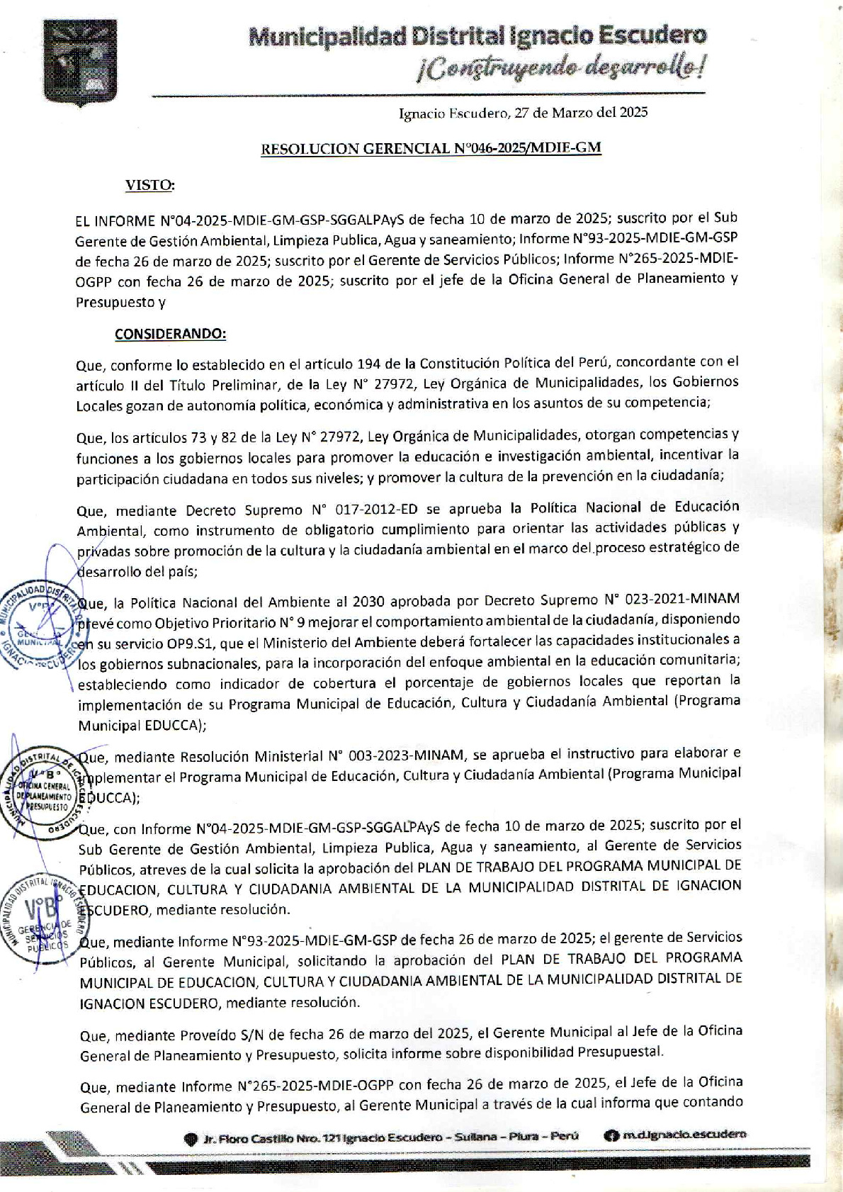 La presente Resolución de Gerencia Municipal aprueba el Plan de Trabajo 2025 del Programa Municipal de Educación, Cultura y Ciudadanía Ambiental de la Municipalidad Distrital de Ignacio Escudero - Sullana (Piura), con la finalidad de definir las actividades de educación, cultura y ciudadanía ambiental que se desarrollaran en la localidad durante el presente año.
