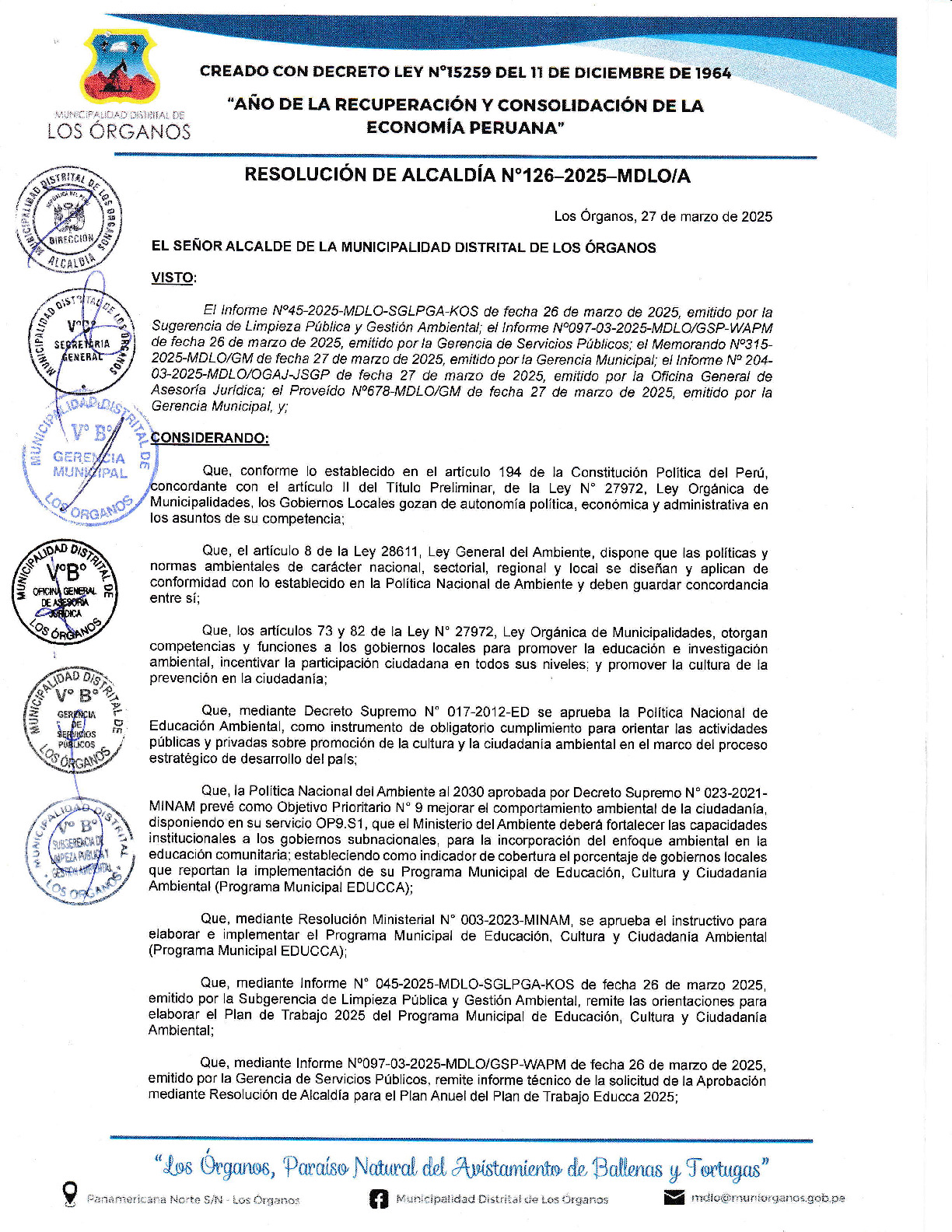 La presente Resolución de Alcaldía aprueba el Plan de Trabajo 2025 del Programa Municipal de Educación, Cultura y Ciudadanía Ambiental de la Municipalidad Distrital de Los Órganos - Talara (Piura), con la finalidad de definir las actividades de educación, cultura y ciudadanía ambiental que se desarrollaran en la localidad durante el presente año.