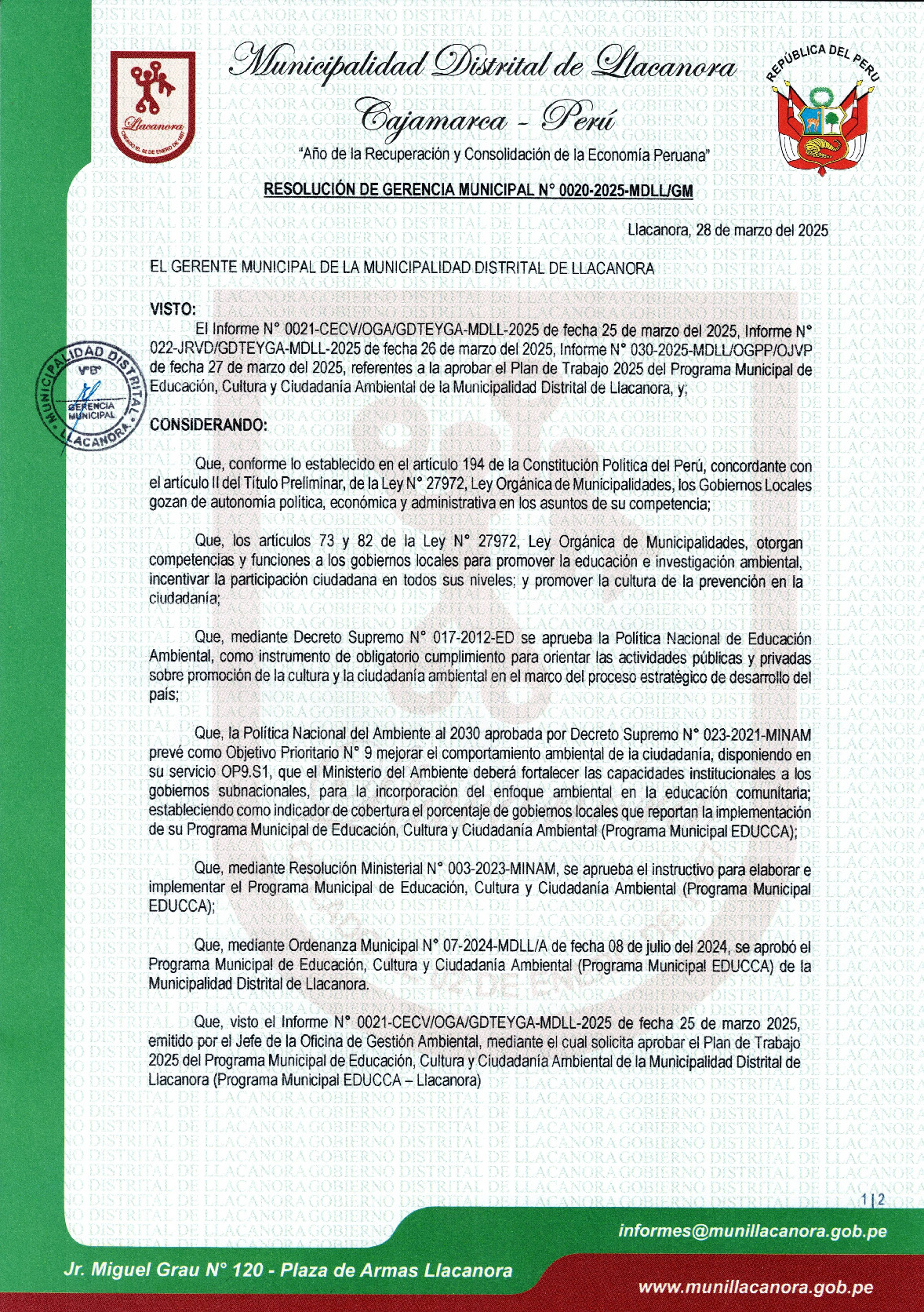 La presente Resolución de Gerencia Municipal aprueba el Plan de Trabajo 2025 del Programa Municipal de Educación, Cultura y Ciudadanía Ambiental de la Municipalidad Distrital de Llacanora - Cajamarca (Cajamarca), con la finalidad de definir las actividades de educación, cultura y ciudadanía ambiental que se desarrollaran en la localidad durante el presente año.