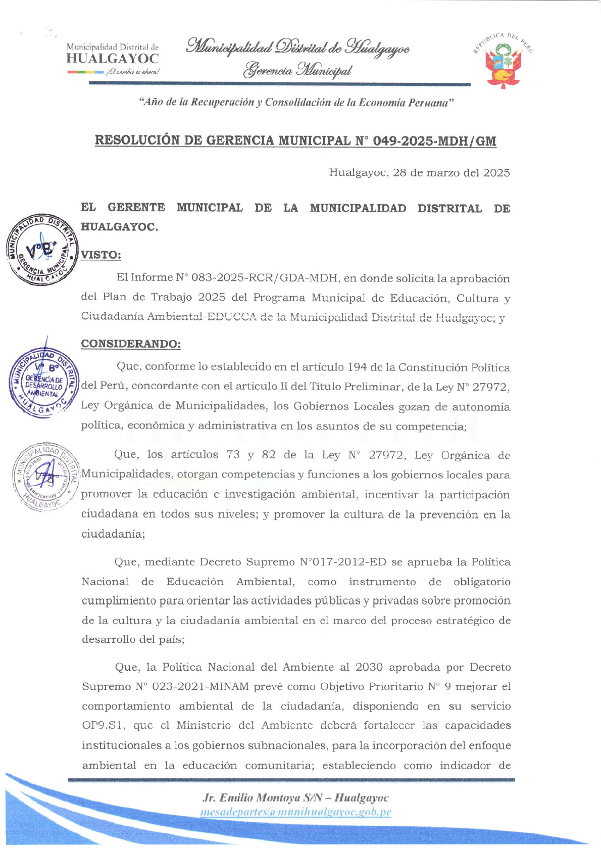 La presente Resolución de Gerencia Municipal aprueba el Plan de Trabajo 2025 del Programa Municipal de Educación, Cultura y Ciudadanía Ambiental de la Municipalidad Distrital de Hualgayoc - Hualgayoc (Cajamarca), con la finalidad de definir las actividades de educación, cultura y ciudadanía ambiental que se desarrollaran en la localidad durante el presente año.