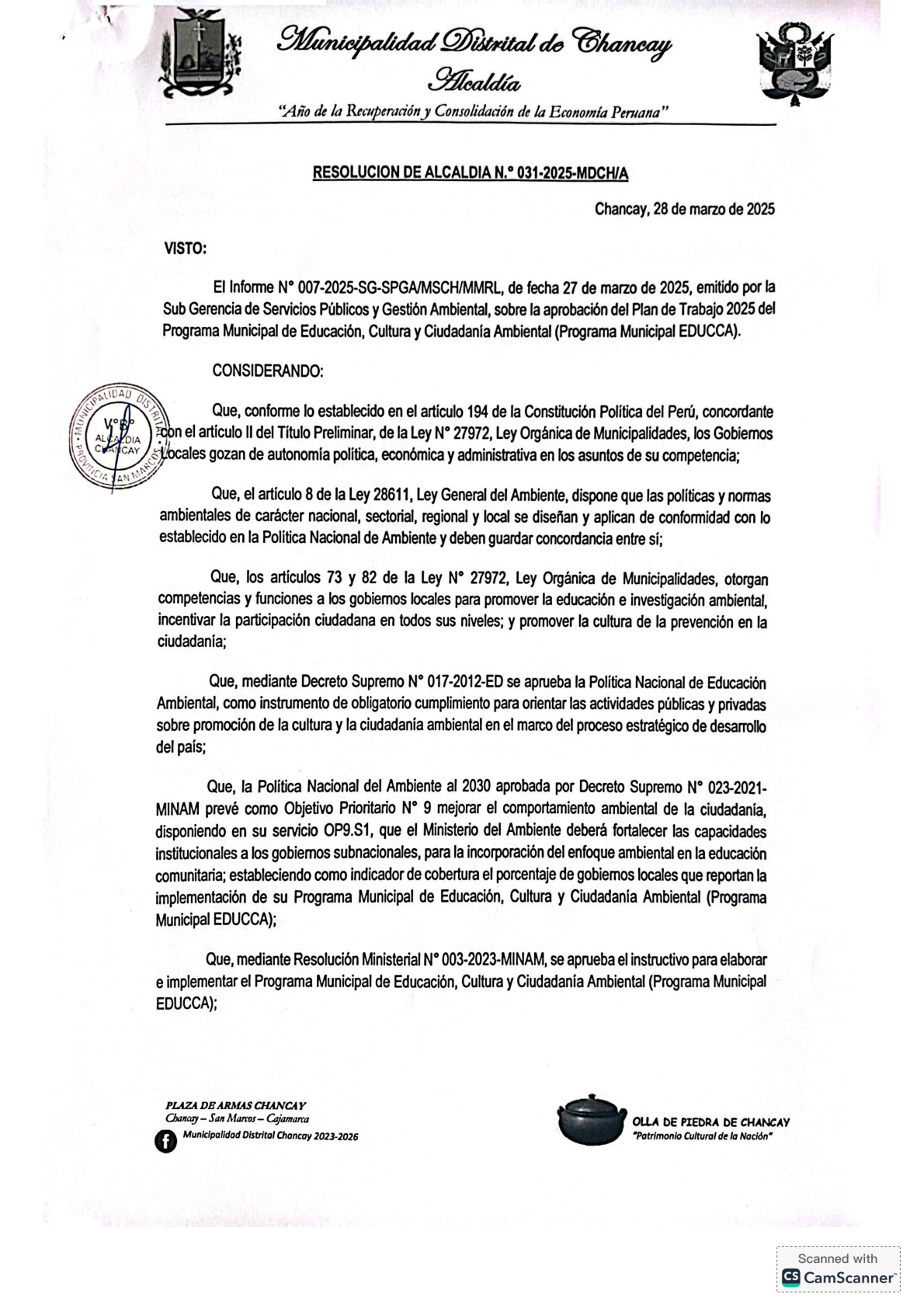 La presente Resolución de Alcaldía aprueba el Plan de Trabajo 2025 del Programa Municipal de Educación, Cultura y Ciudadanía Ambiental de la Municipalidad Distrital de Chancay -San Marcos (Cajamarca), con la finalidad de definir las actividades de educación, cultura y ciudadanía ambiental que se desarrollaran en la localidad durante el presente año.