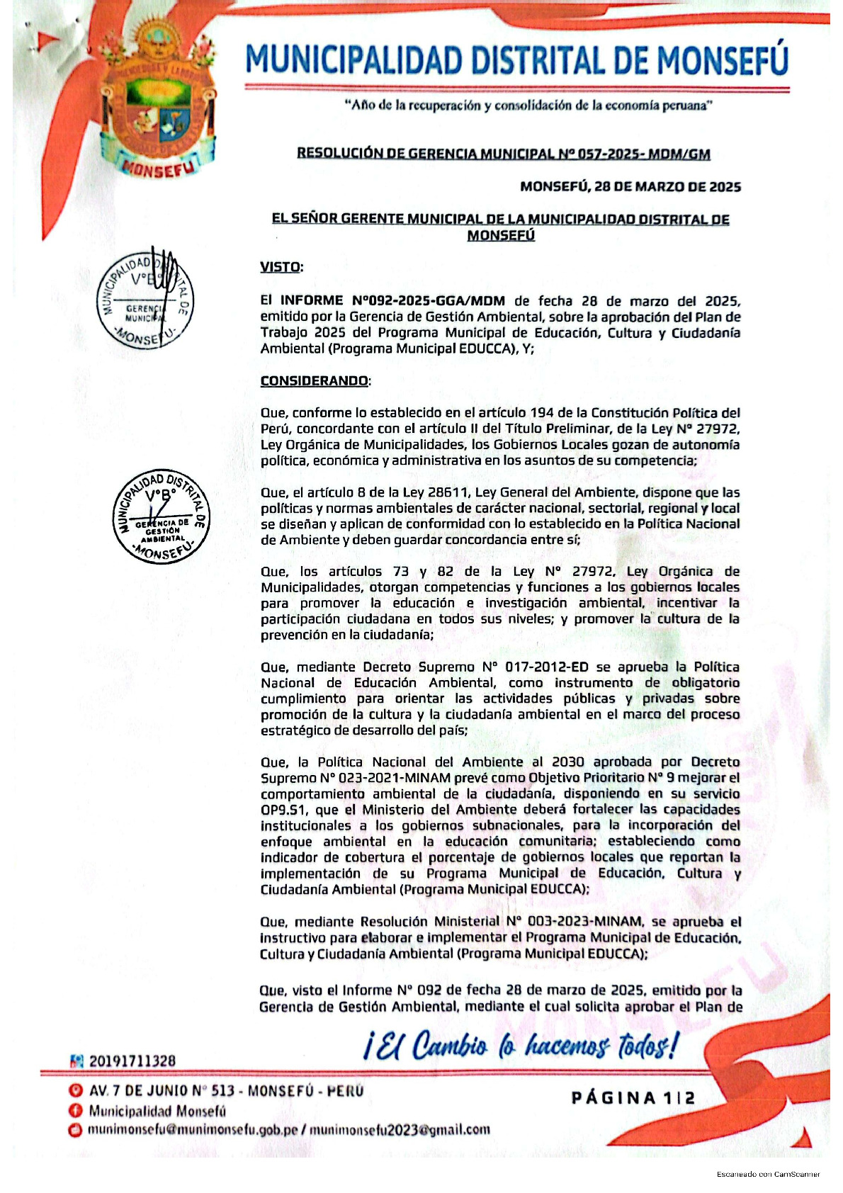 La presente Resolución de Gerencia Municipal aprueba el Plan de Trabajo 2025 del Programa Municipal de Educación, Cultura y Ciudadanía Ambiental de la Municipalidad Distrital de Monsefú - Chiclayo (Lambayeque), con la finalidad de definir las actividades de educación, cultura y ciudadanía ambiental que se desarrollaran en la localidad durante el presente año.